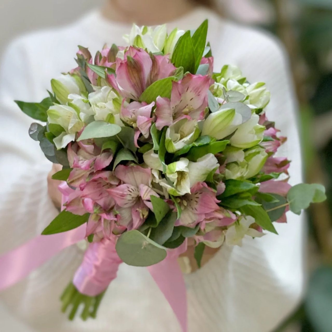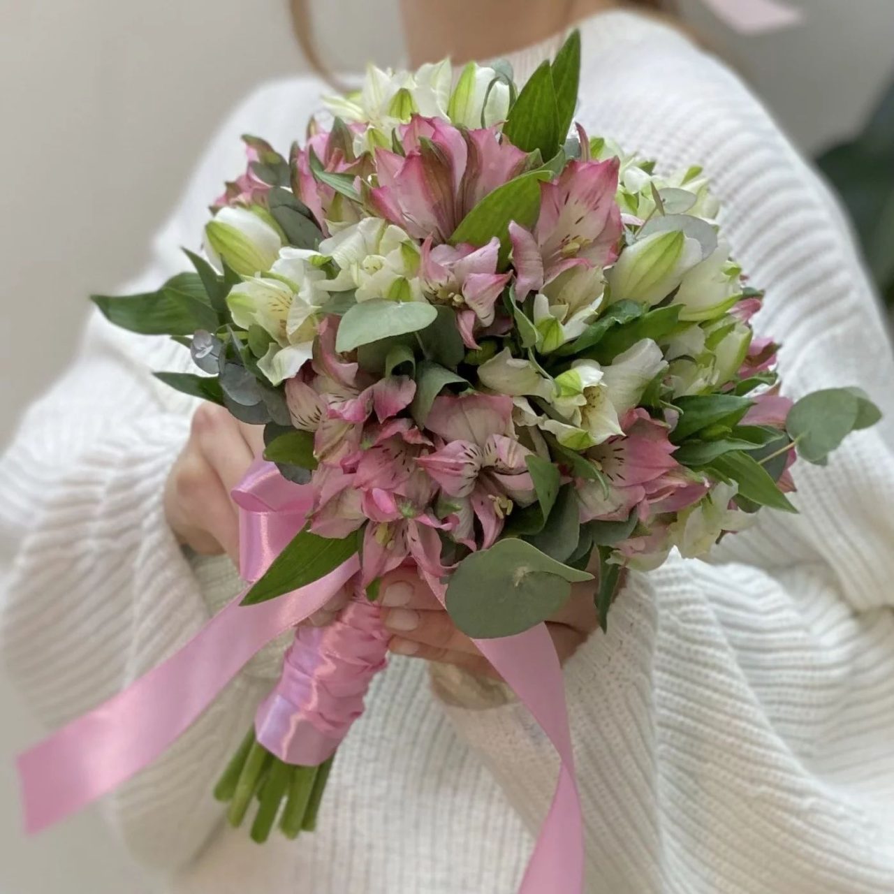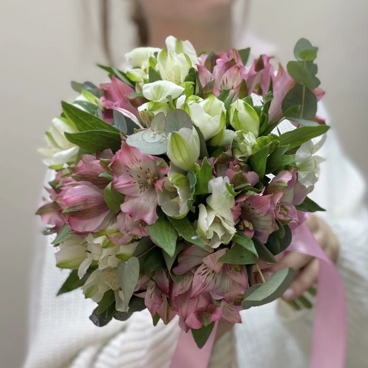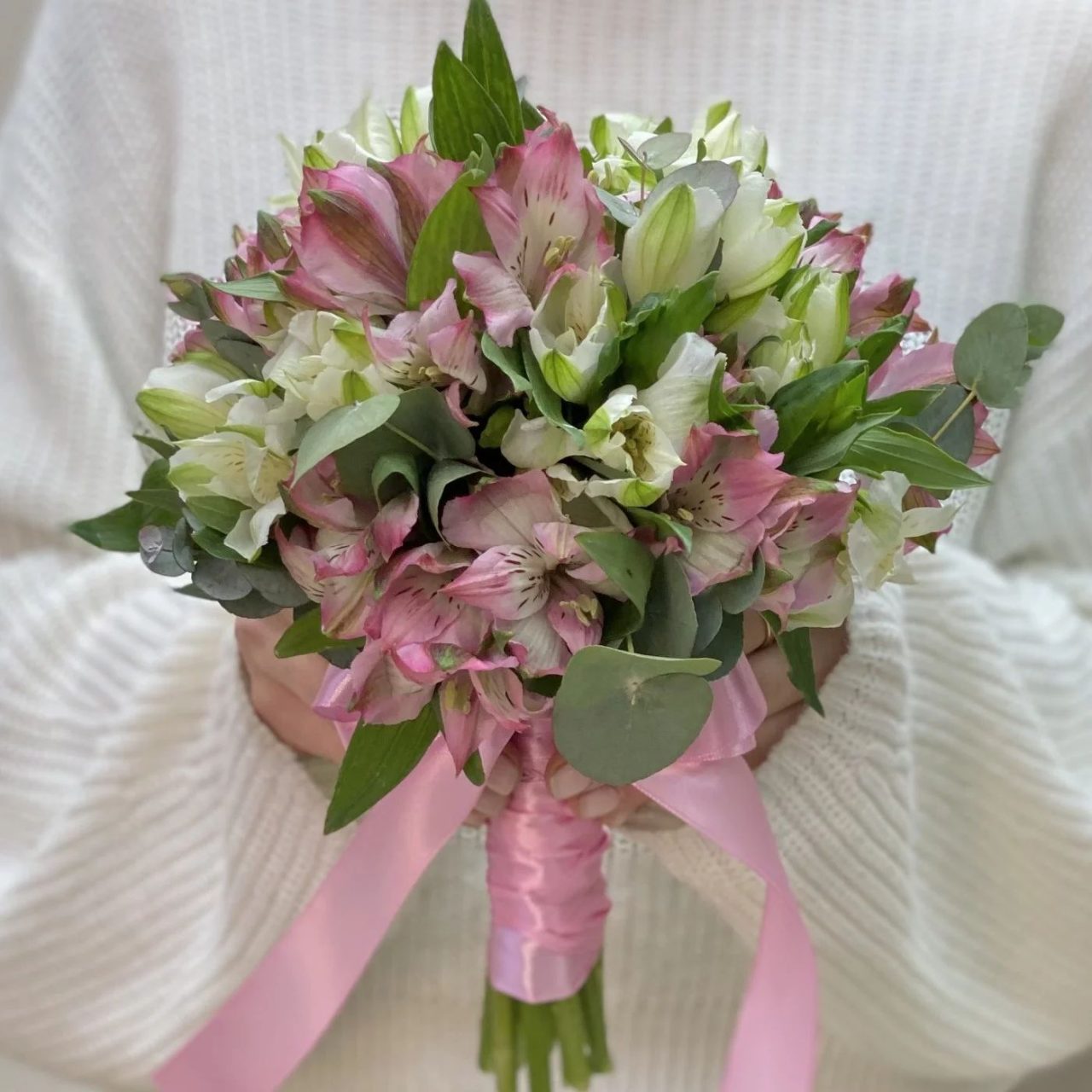 Designul lejer și armonios evidențiază frumusețea alstroemeriei, o floare delicată și rezistentă, completată de accentele verzi de eucalipt care adaugă rafinament și naturalețe. Buchetul este ușor de purtat și foarte fotogenic, potrivit pentru un stil modern și feminin.
