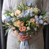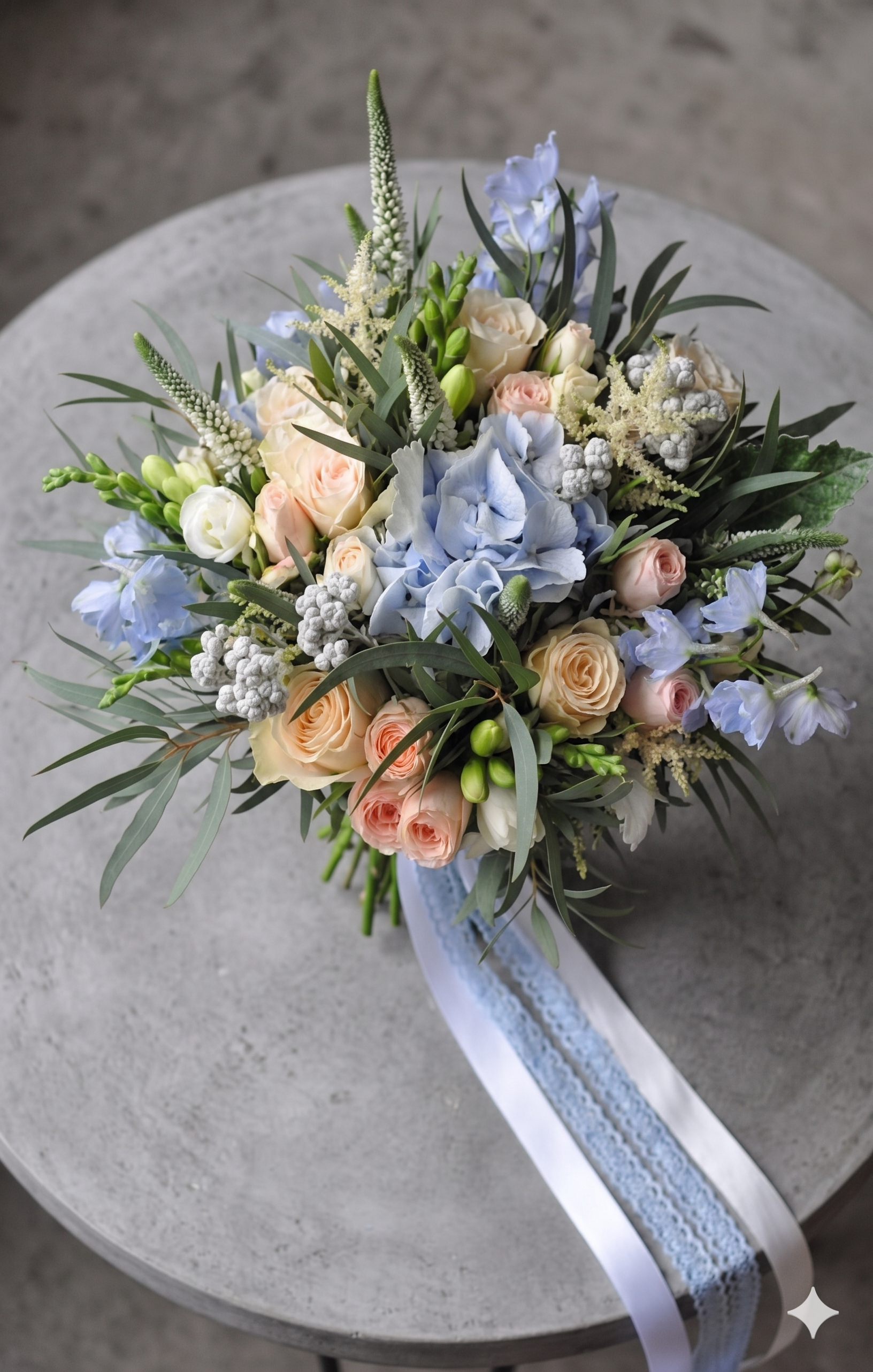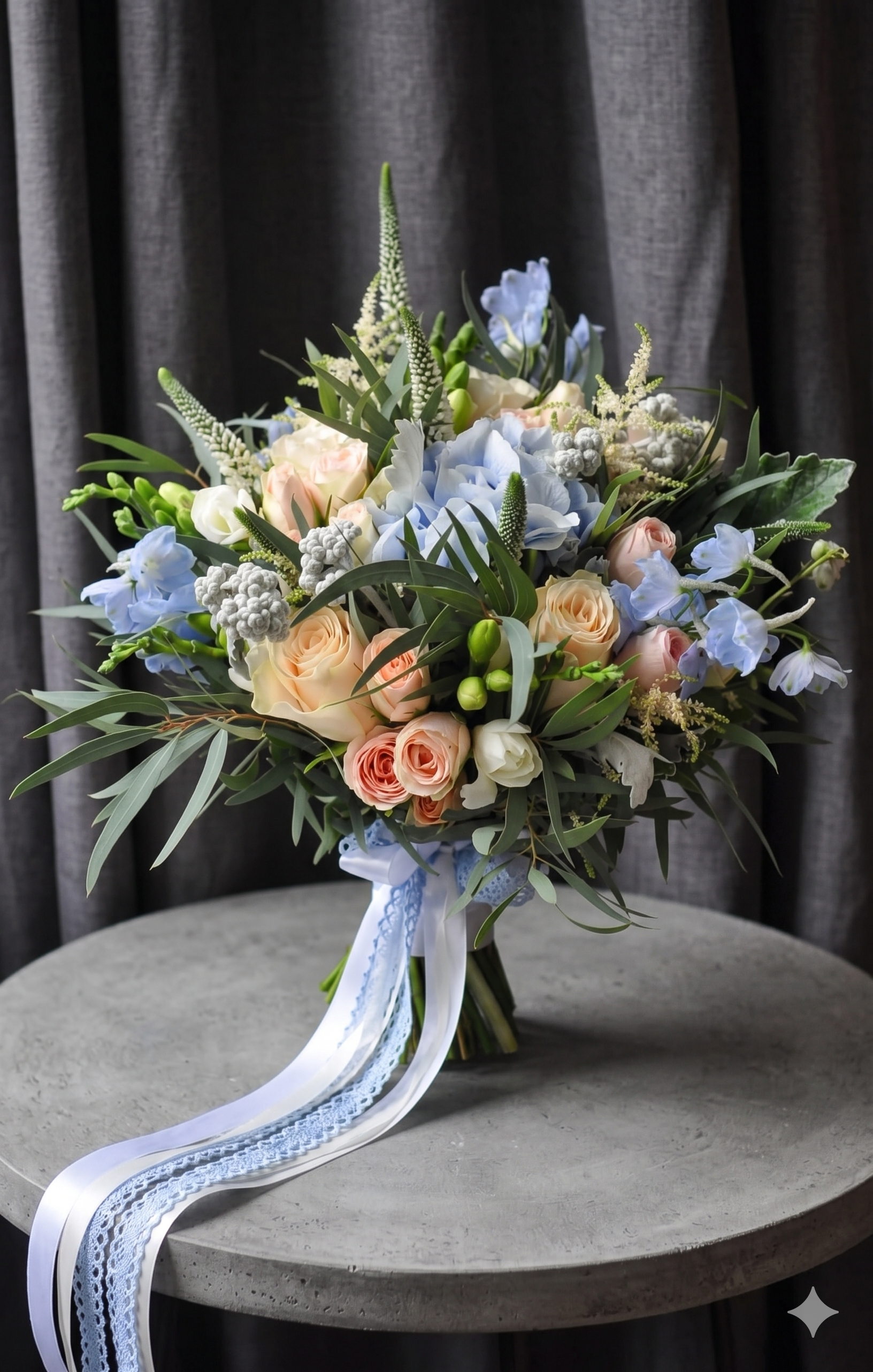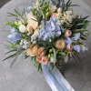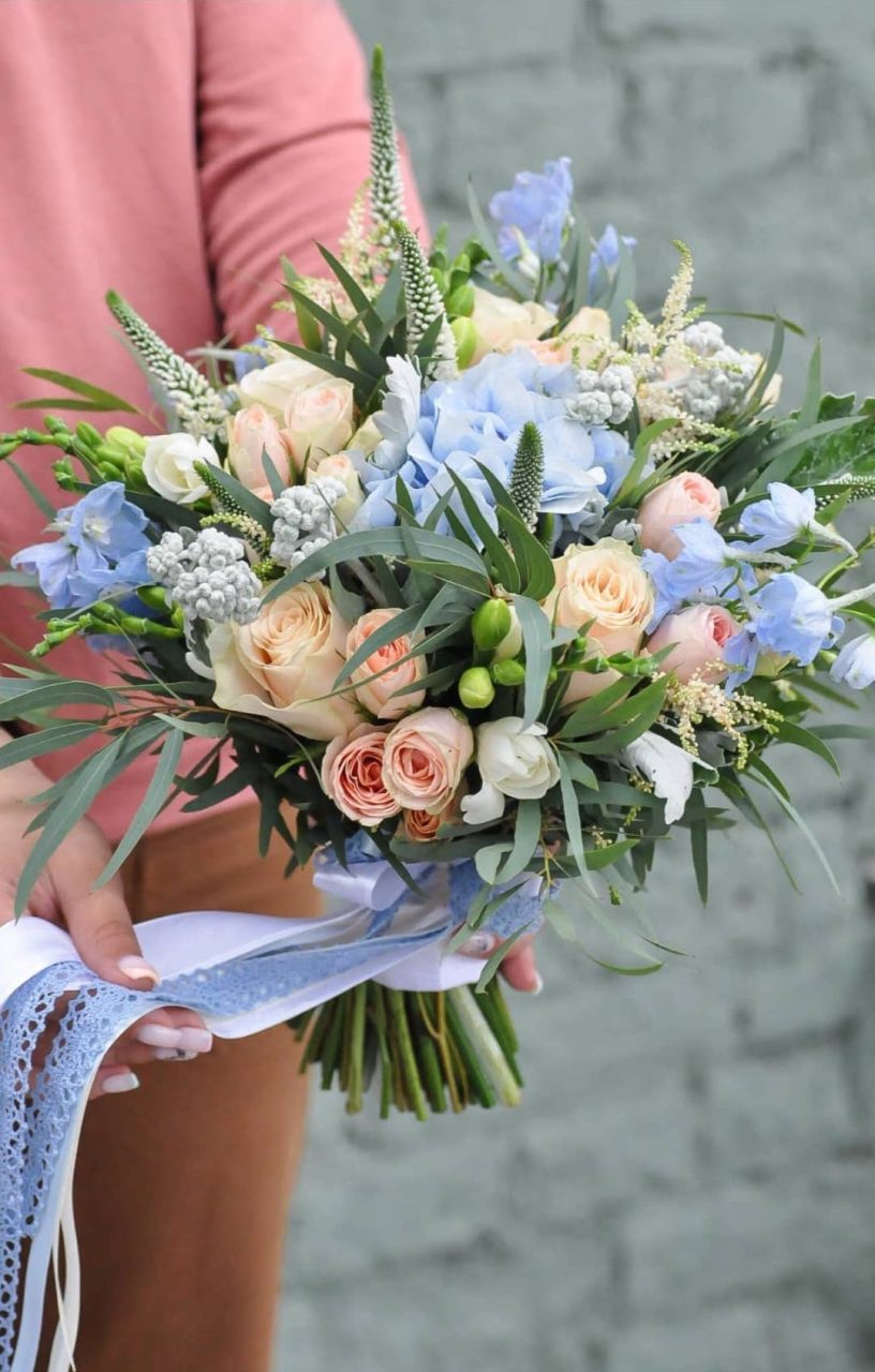 Buchet de Mireasă: Eleganță în Nuanțe de Somon și Albastru