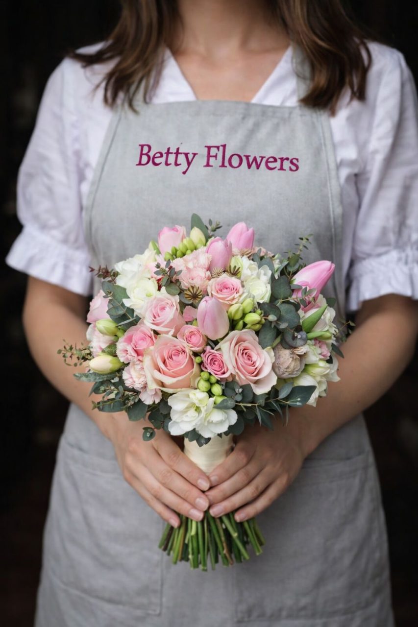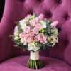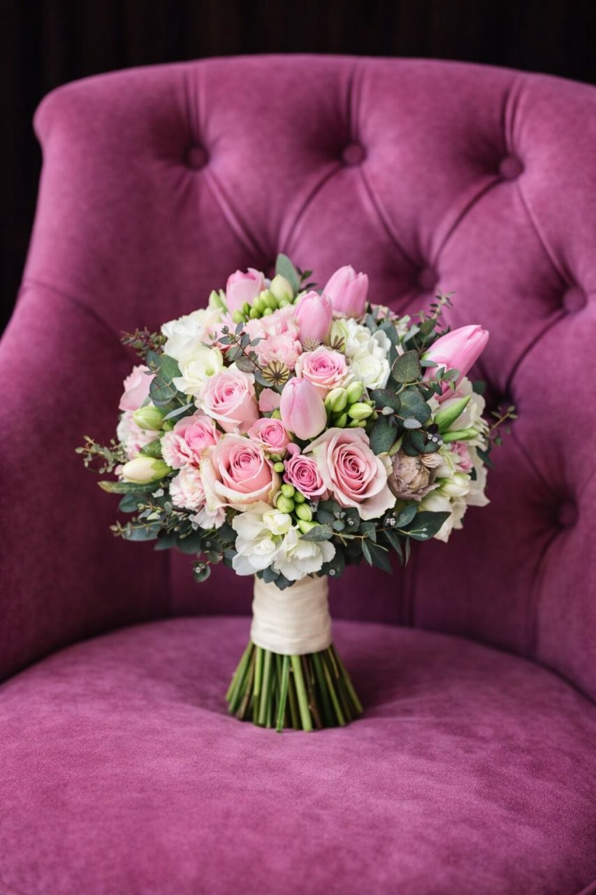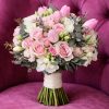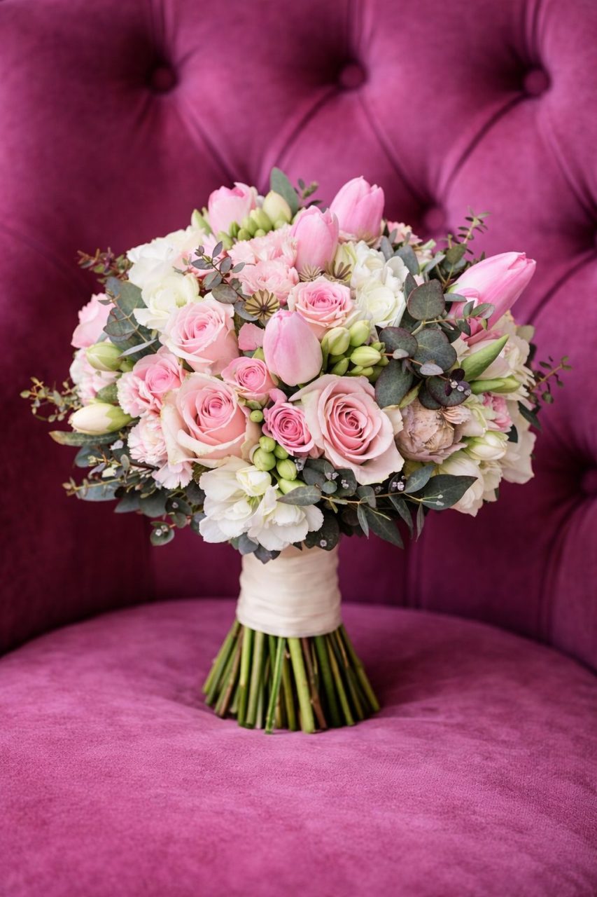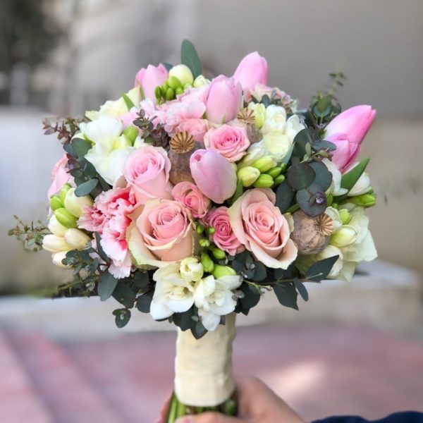 Buchet de mireasă romantic, realizat din trandafiri roz, lalele delicate, frezii albe și accente de verdeață naturală, aranjat manual într-un stil rafinat. Ideal pentru nunți elegante și romantice. Buchetul se comandă cu minimum 10 zile înainte de eveniment, pentru a asigura flori proaspete și o execuție impecabilă.