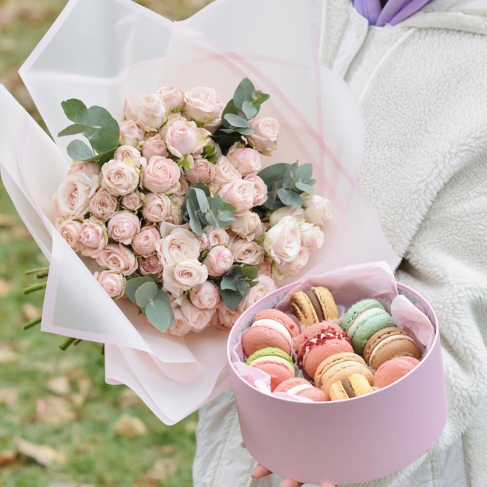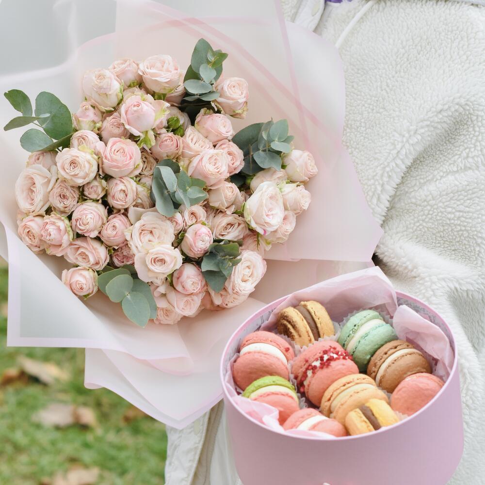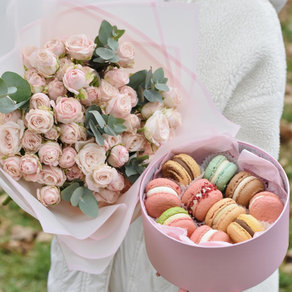 Încântați-vă simțurile cu acest pachet special! Buchetul nostru de trandafiri mini, format din 9 flori delicate de culoare roz deschis, este ambalat într-un packaging rafinat, care adaugă o notă elegantă. Completați experiența dulce cu o cutie rotundă ce conține 10 macarons deliciosi, disponibili în culori variate și aromă tentantă. Perfect pentru a aduce un zâmbet pe fața celor dragi sau pentru a sărbători momente deosebite! Alegeți să dăruiți bucurie!