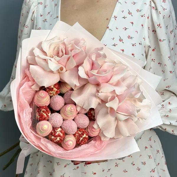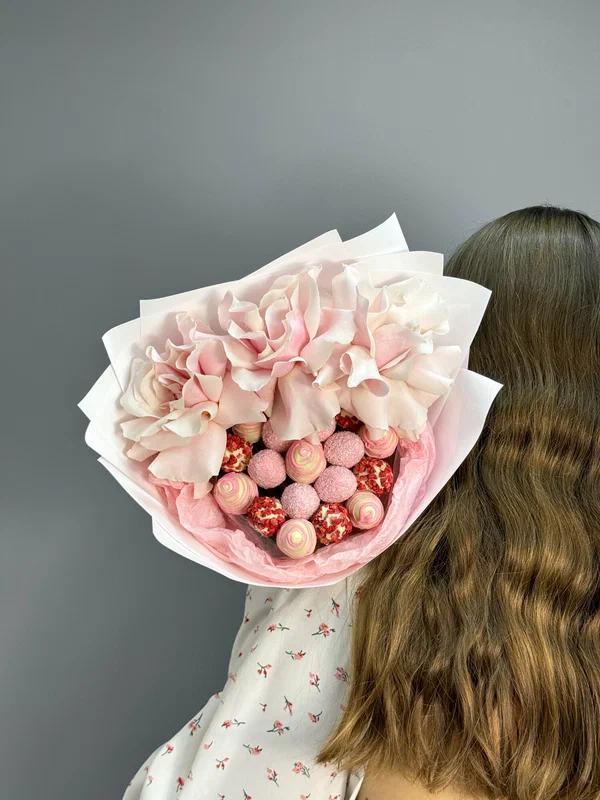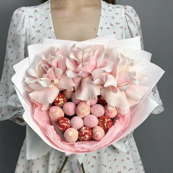 Buchet Delicat cu Trandafiri Pastel și Căpșuni în Ciocolată