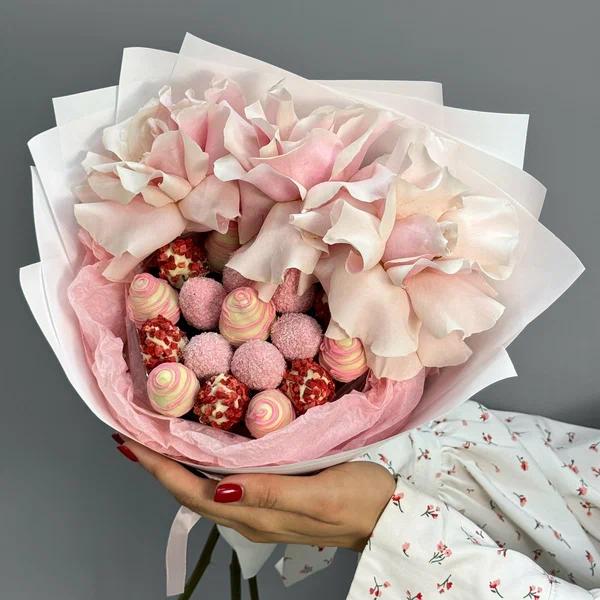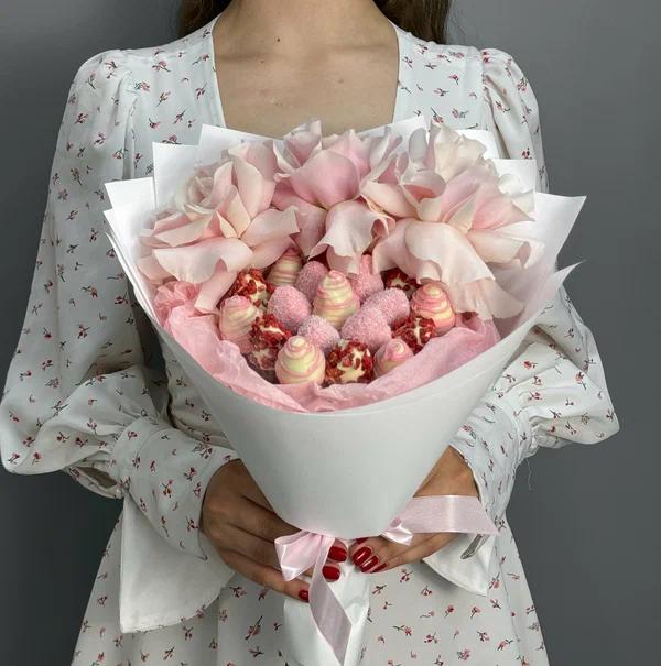 Un buchet elegant și rafinat, creat pentru momentele în care vrei să impresionezi prin finețe și gust. Îmbinarea trandafirilor pastel, atent flexați pentru un efect spectaculos, cu căpșunile proaspete glazurate în ciocolată belgiană transformă acest aranjament într-un cadou premium, perfect pentru aniversări, declarații de dragoste sau surprize romantice.