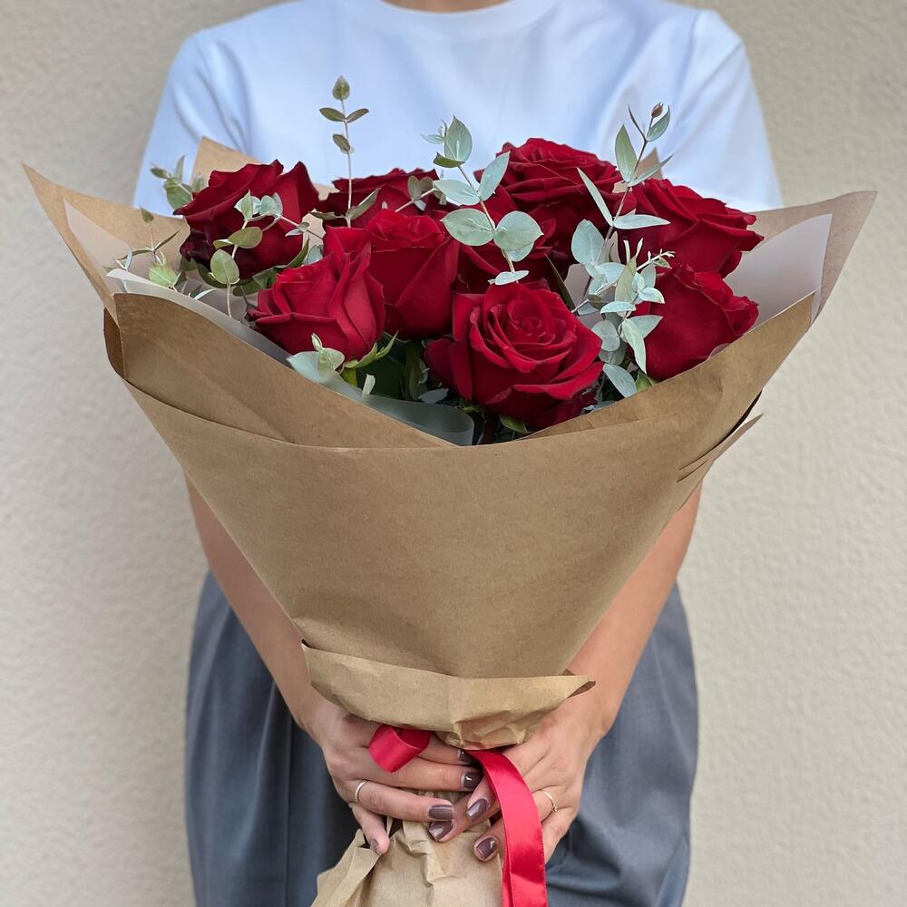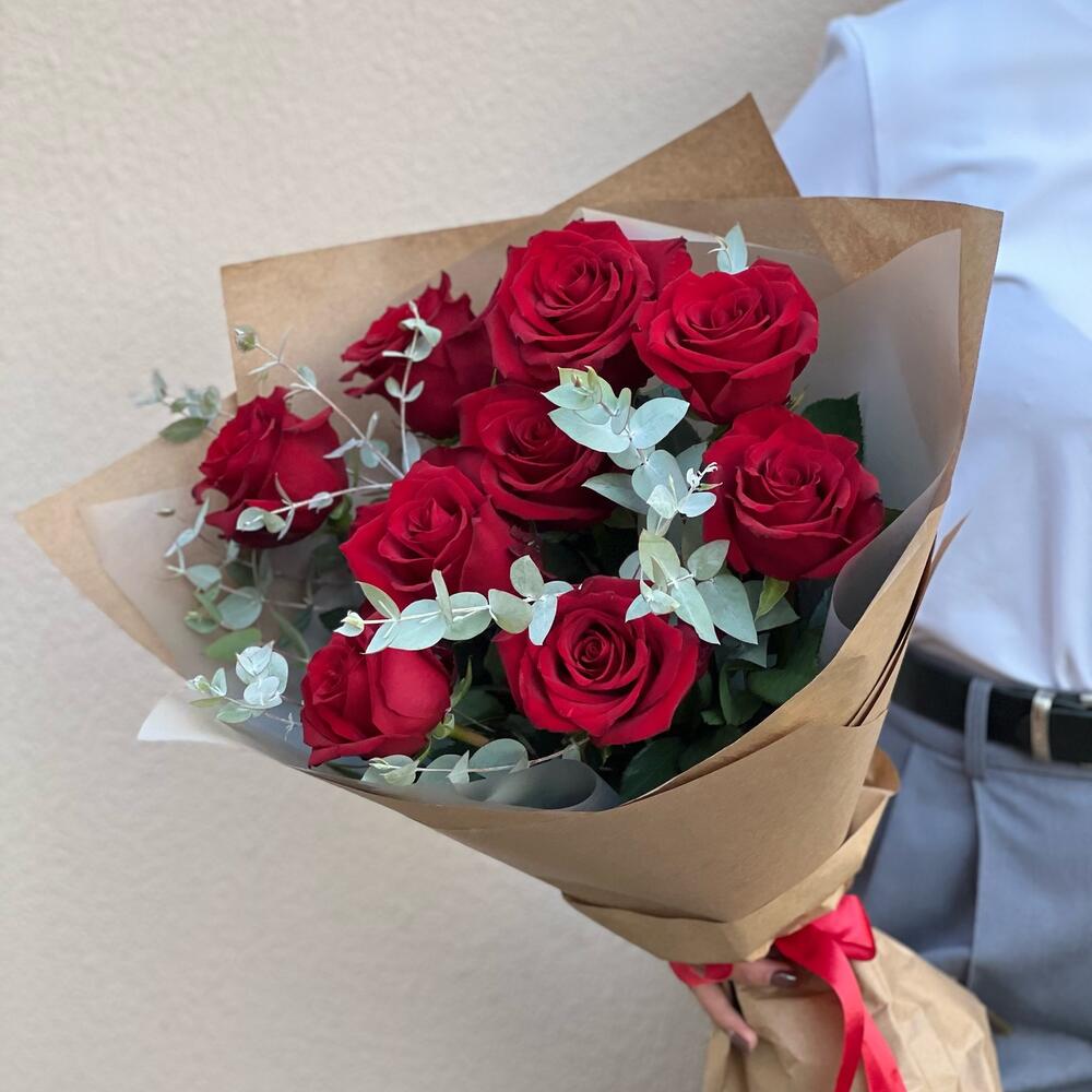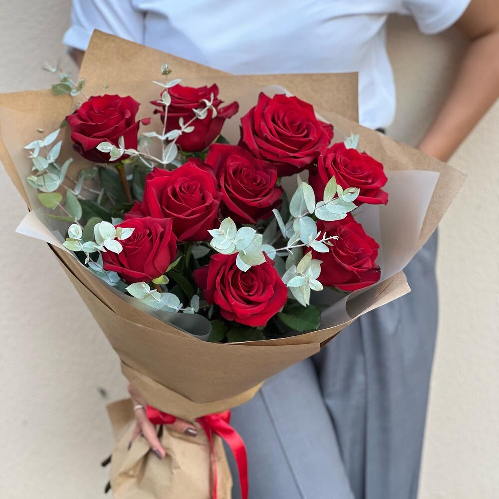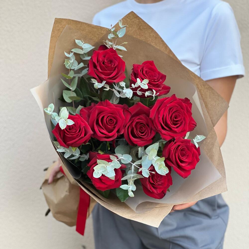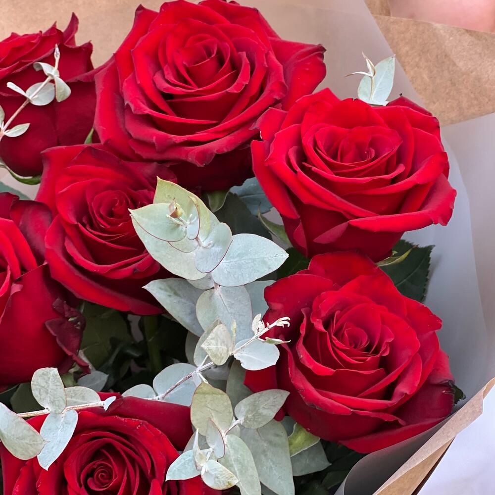 Descriere produs: Buchet din 9 Trandafiri Roșii și Eucalipt