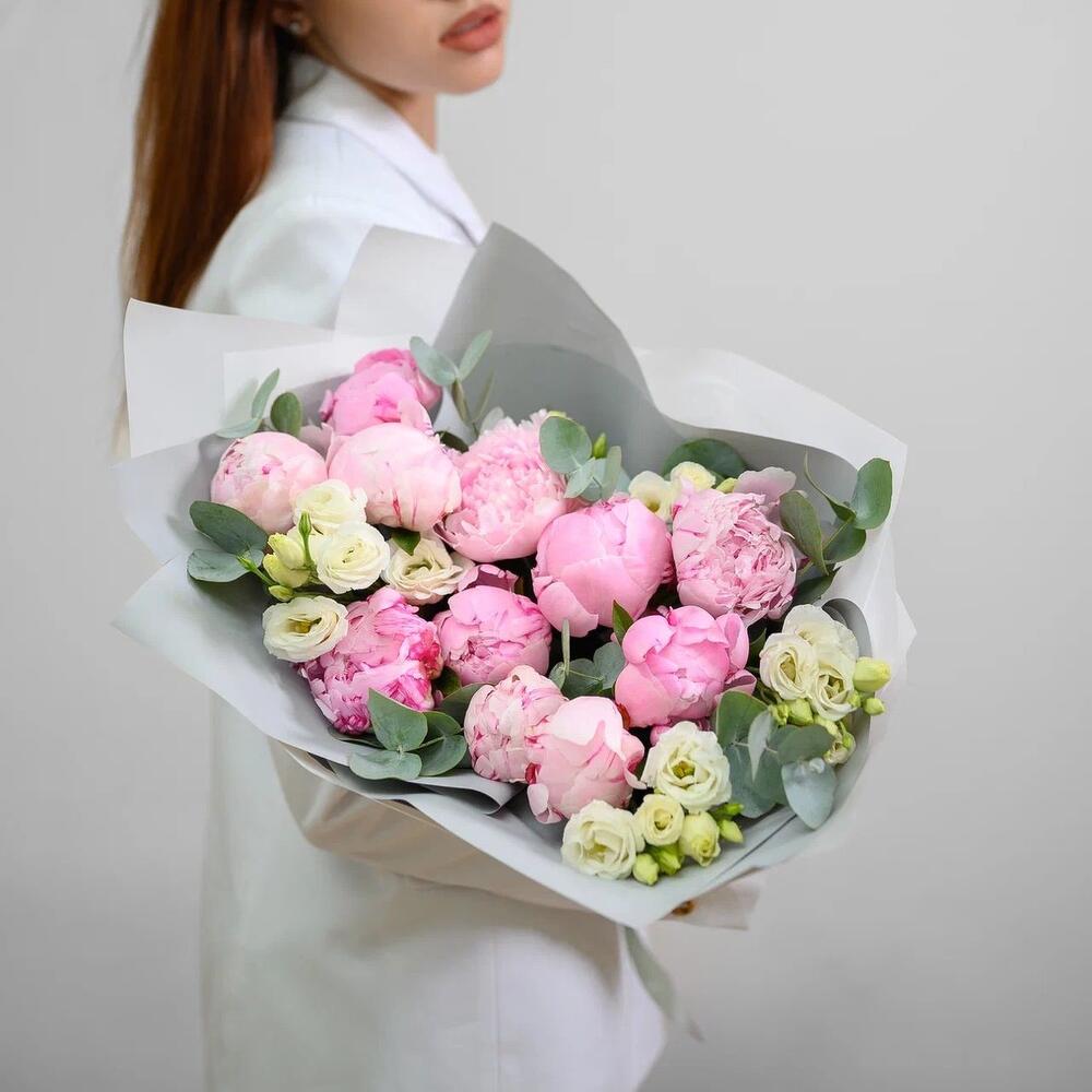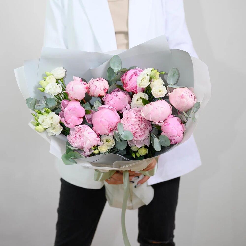 Buchet Din Bujori Roz Si Eustome Albe