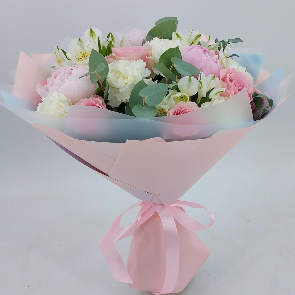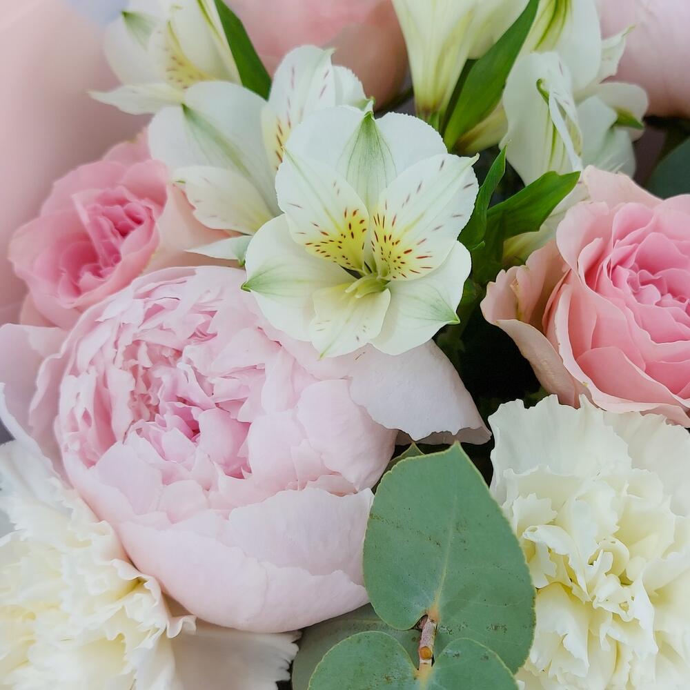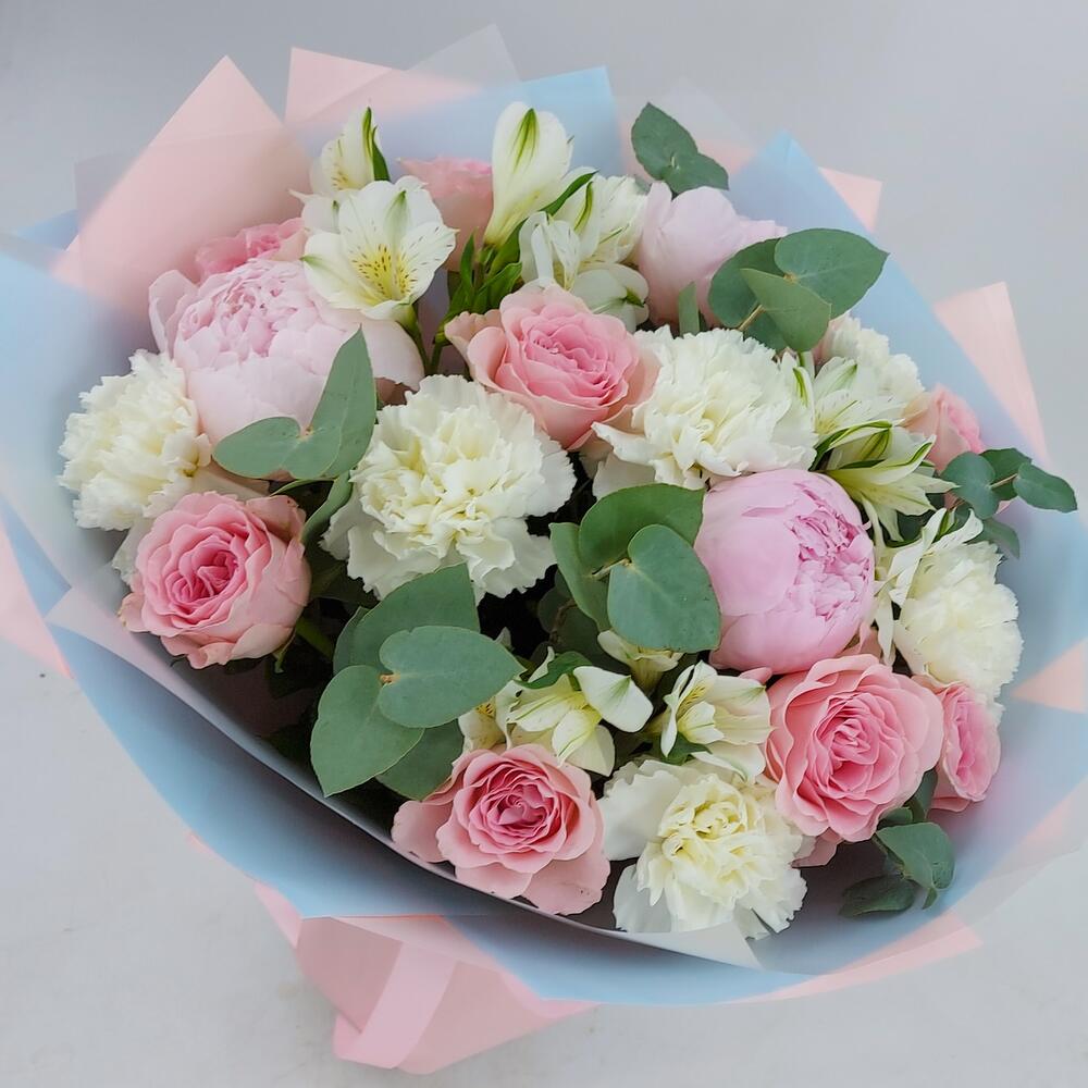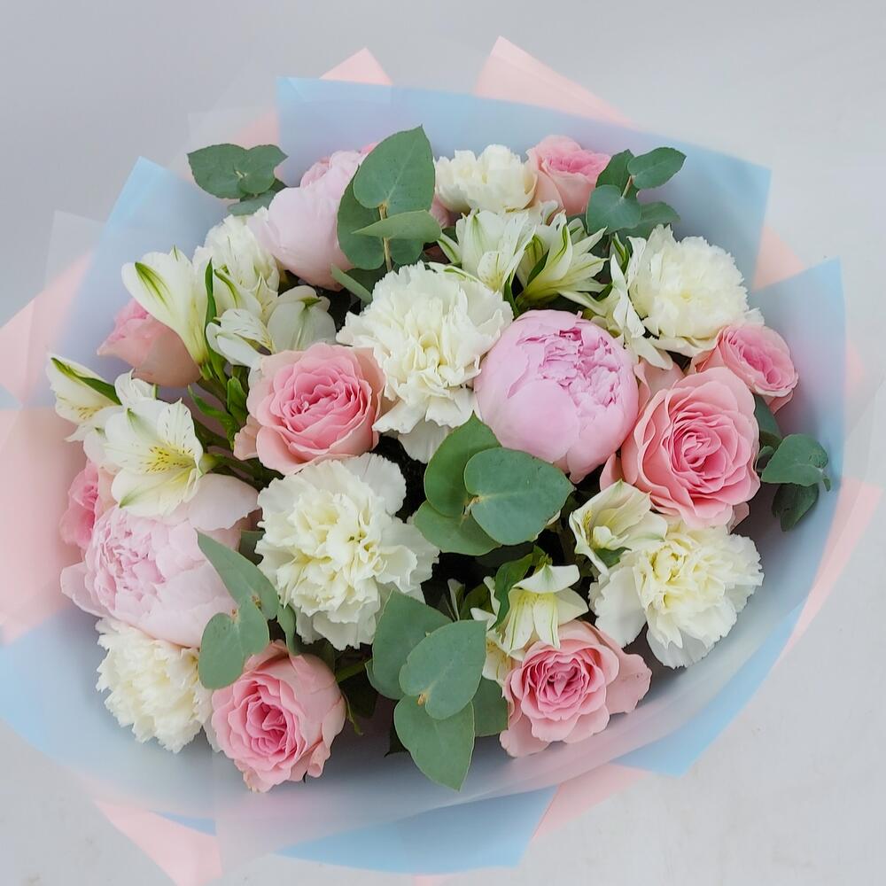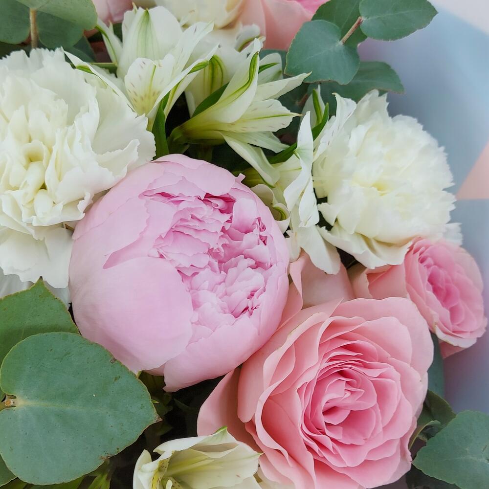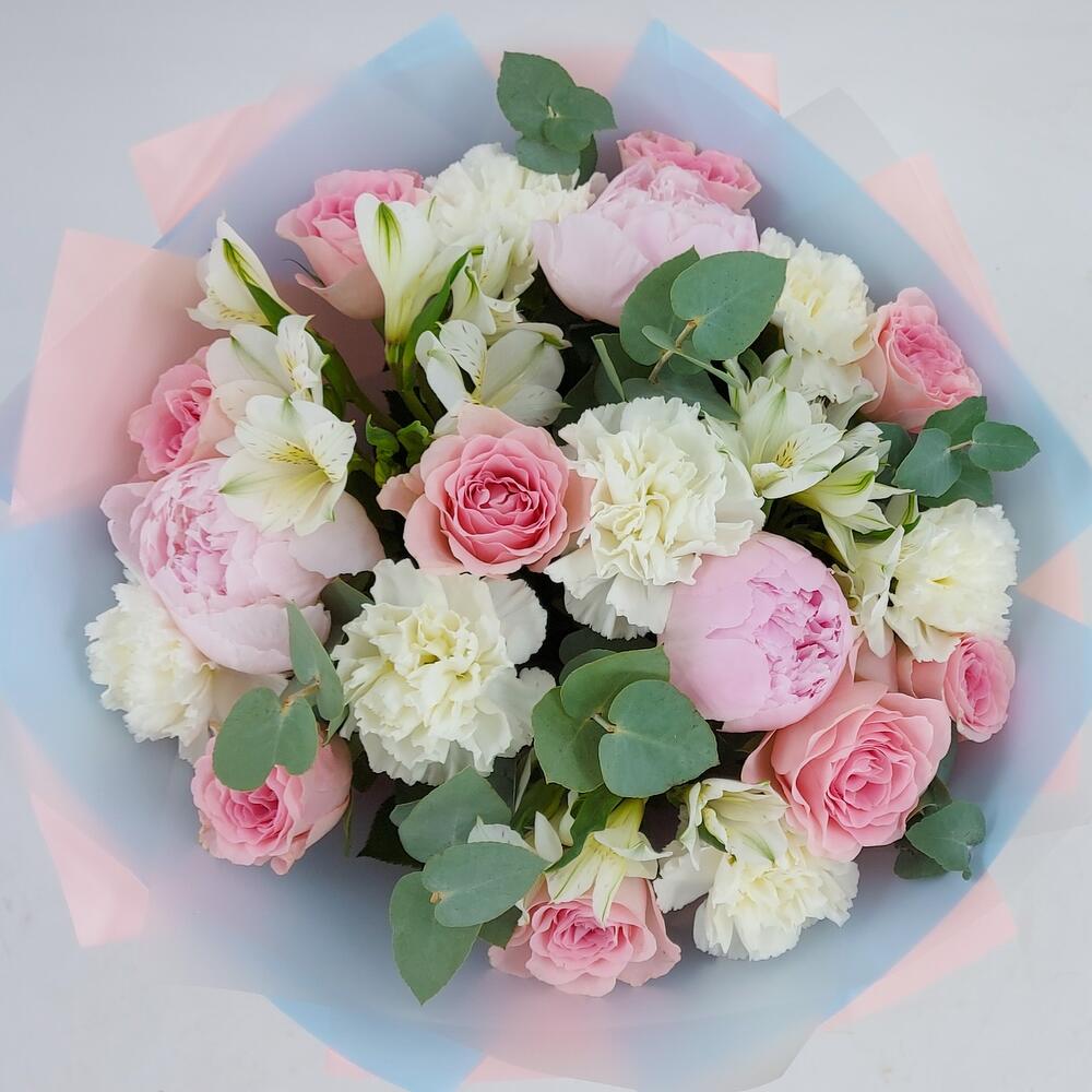 Buchetul conține: 3 fire de alistromerie albă, 3 fire de bujori roz, 7 fire de dianthus alb și 9 fire de trandafiri roz, totul completat cu 7 fire de eucalipt. Ambalat într-un design elegant, de culoare roz și bleu, acest buchet este o alegere ideală pentru a transmite emoții profunde și sincere.