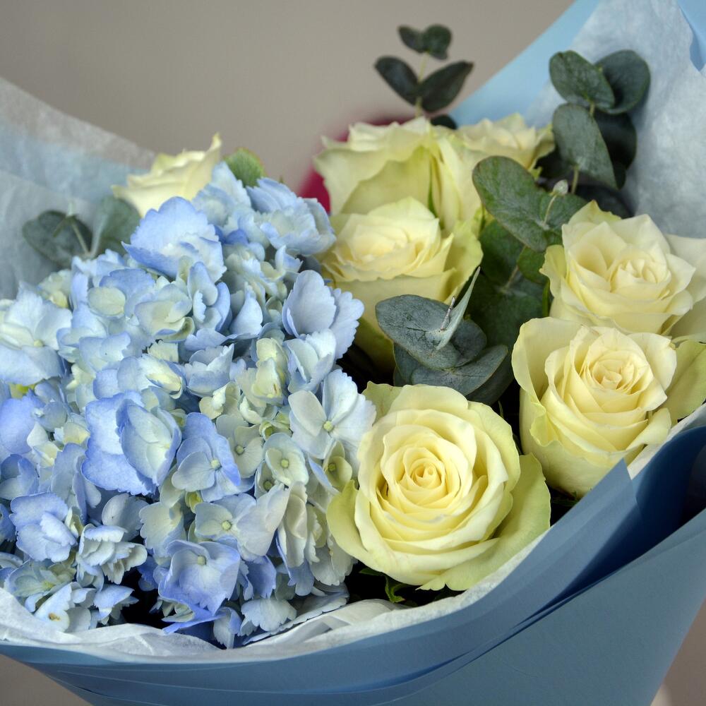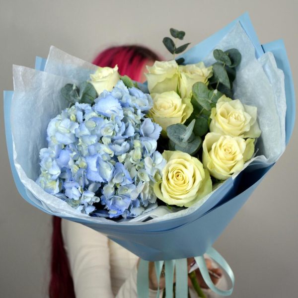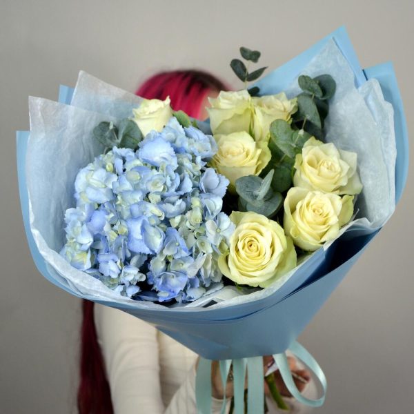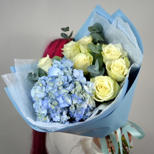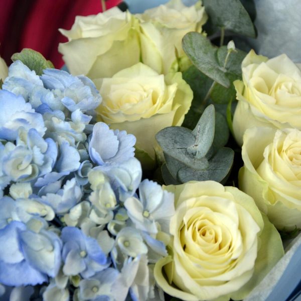 Buchet Din Hortensie Blue Si Trandafiri Albi