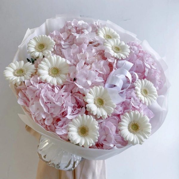 Buchet Din Hortensie Roz Si Gerbere Albe