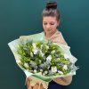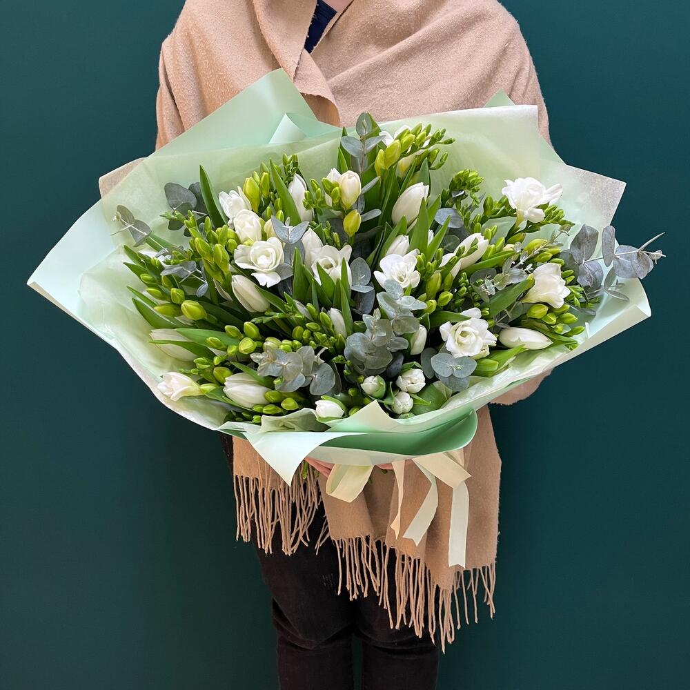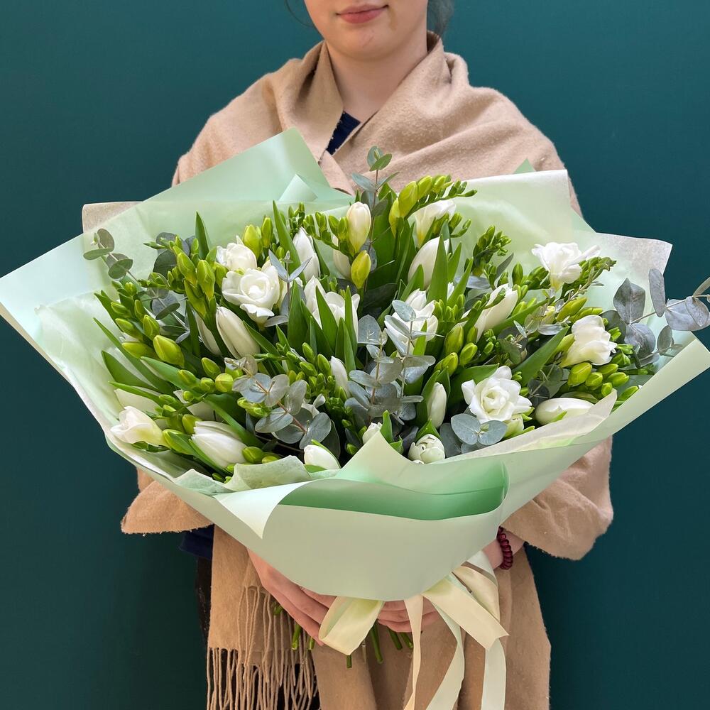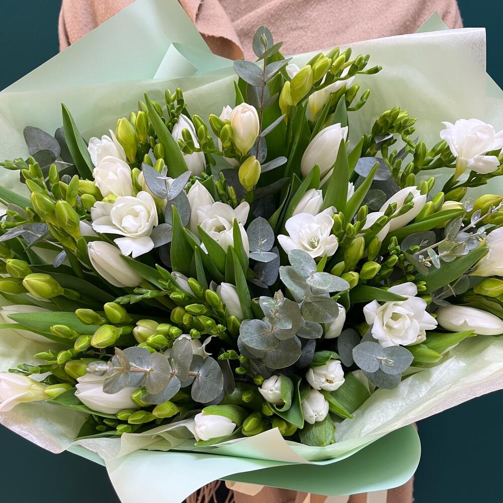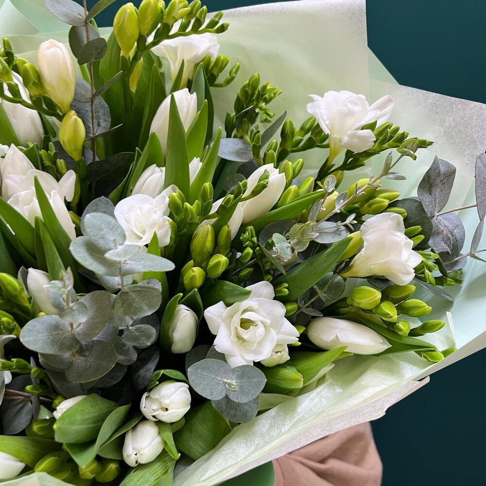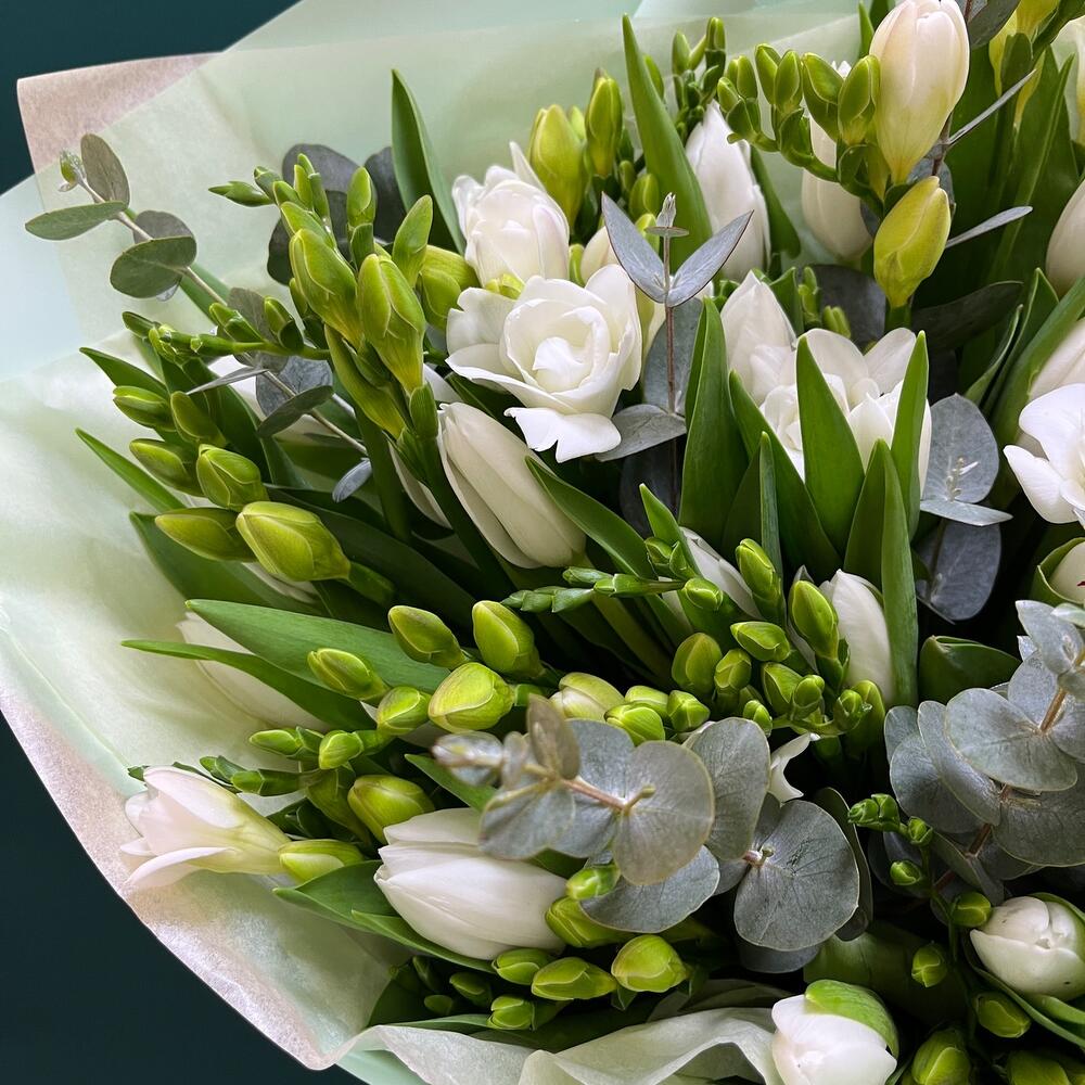 Încântă-ți simțurile cu acest buchet elegant, plin de prospețime și aromă de primăvară. Buchetul nostru, în nuanțe delicate de alb, este compus din 11 fire de frezii albe și 29 fire de lalele albe, completate de 7 fire de eucalipt, ce adaugă un plus de rafinament.