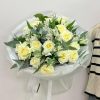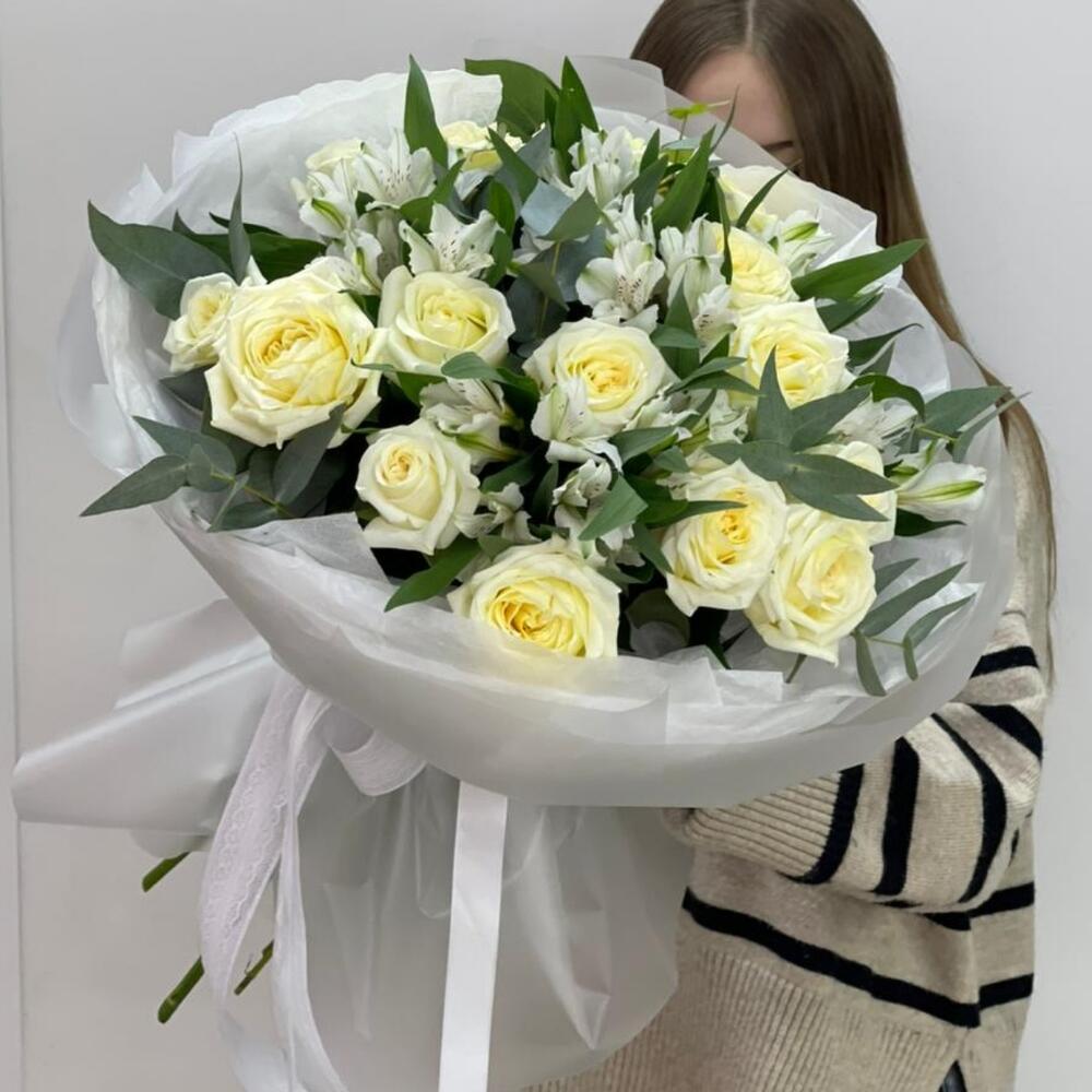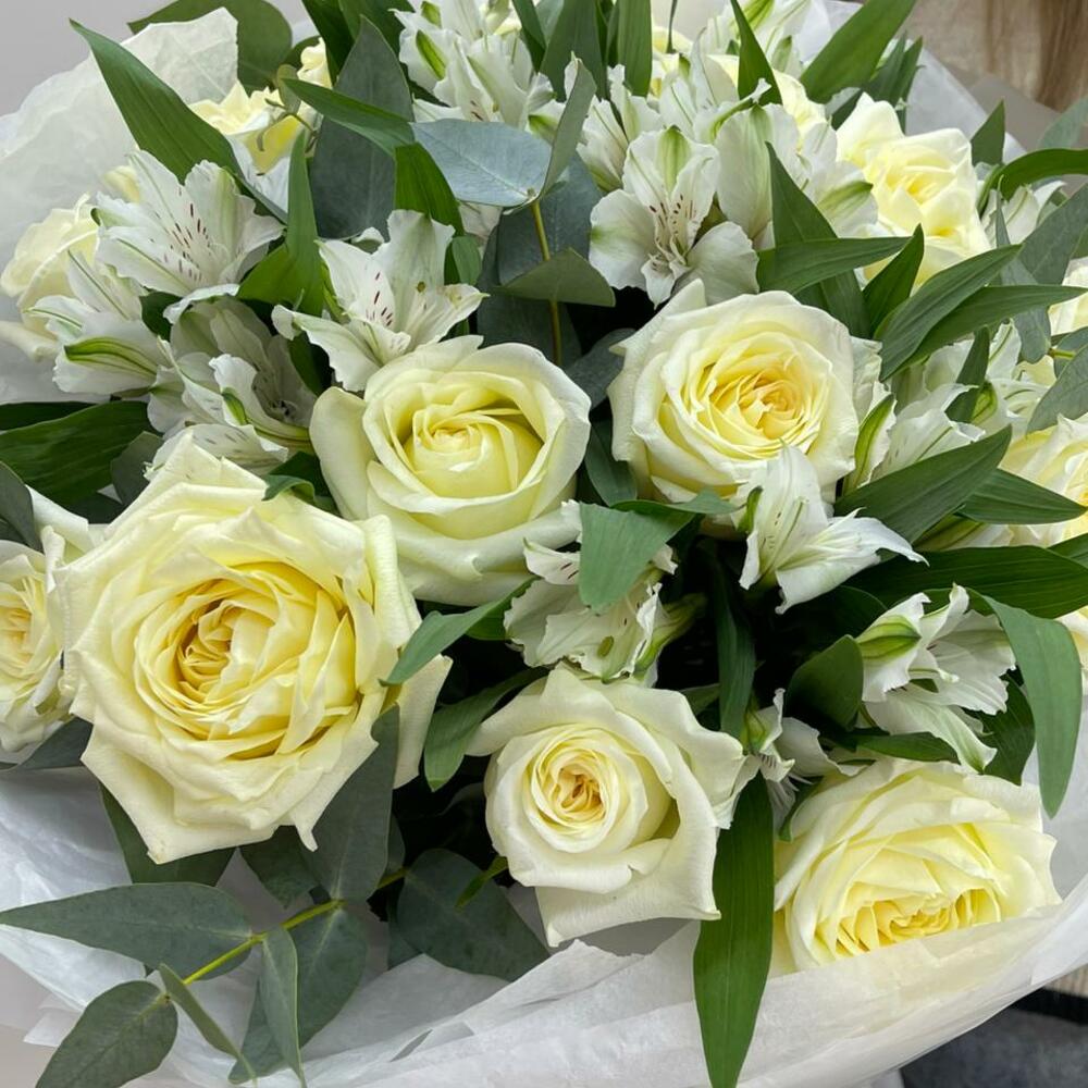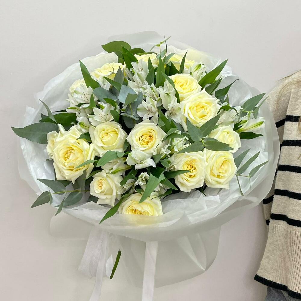 Îți prezentăm cu mândrie buchetul nostru elegant, Buchet Din Trandafiri Albi și Alstromerie Albă. Acest aranjament floral spectaculos, cu un diametru de 45 cm și o înălțime de 50 cm, aduce un strop de rafinament în orice spațiu. Buchetul conține 15 trandafiri albi strălucitori și 8 fire de alstromerie albă delicate, totul ambalat cu grijă în emballaj alb.