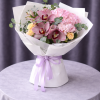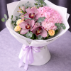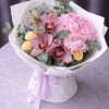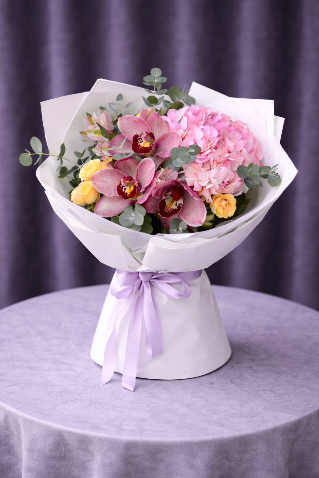 Acest buchet elegant impresionează prin textura bogată a hortensiei, delicatețea orhideelor cymbidium și prospețimea trandafirilor spray galbeni, completate de frunzele de eucalipt care oferă volum și un aspect natural. Este alegerea perfectă pentru persoanele care apreciază florile fine și aranjamentele florale premium.