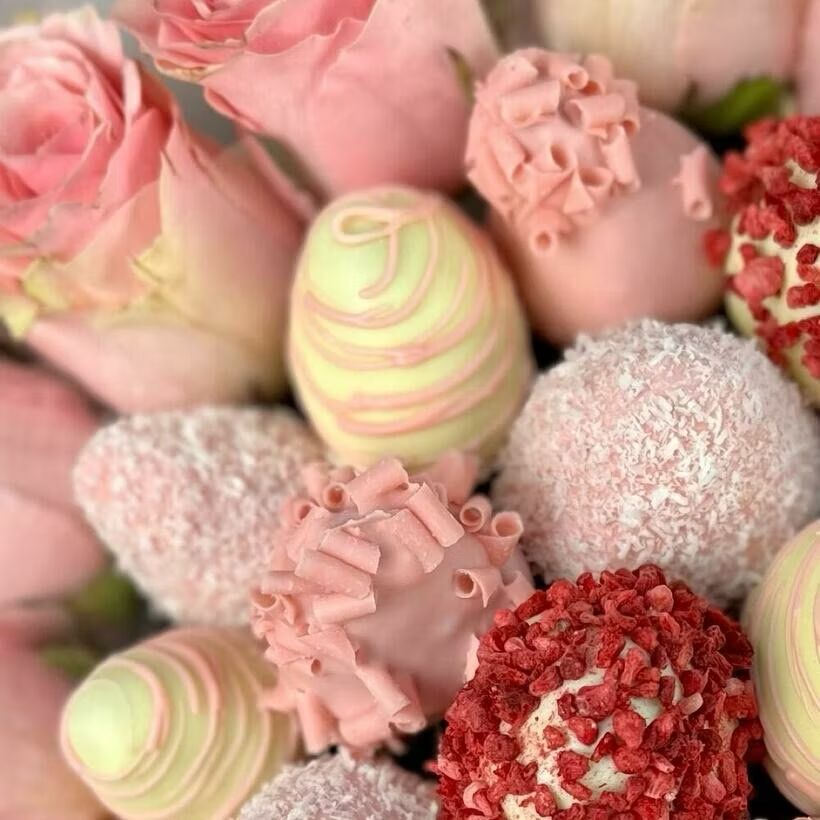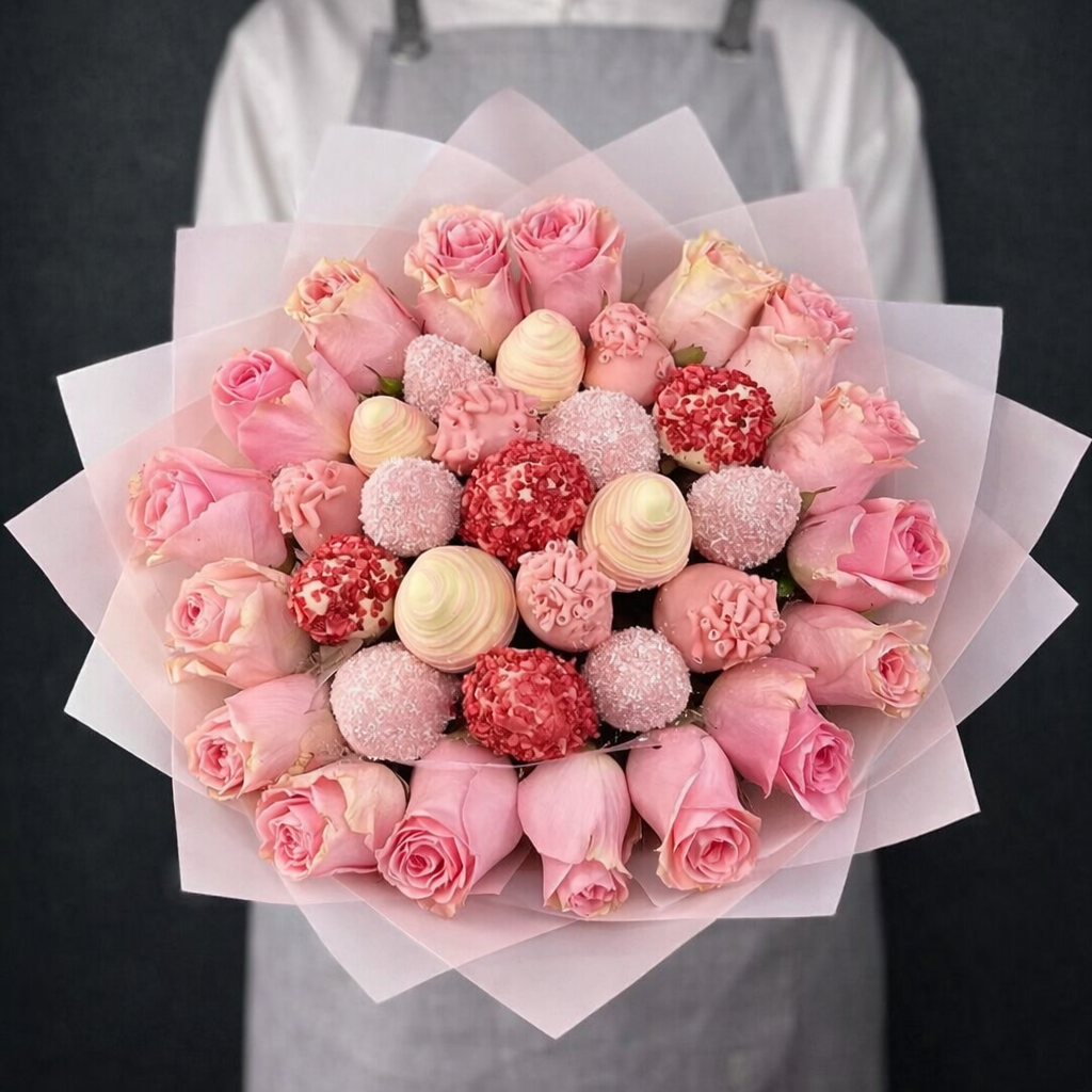 Buchetul este aranjat manual într-o formă armonioasă și echilibrată, combinând delicatețea trandafirilor roz pal cu rafinamentul căpșunilor glazurate în ciocolată. Este alegerea ideală pentru aniversări, ocazii romantice, surprize speciale sau cadouri elegante.