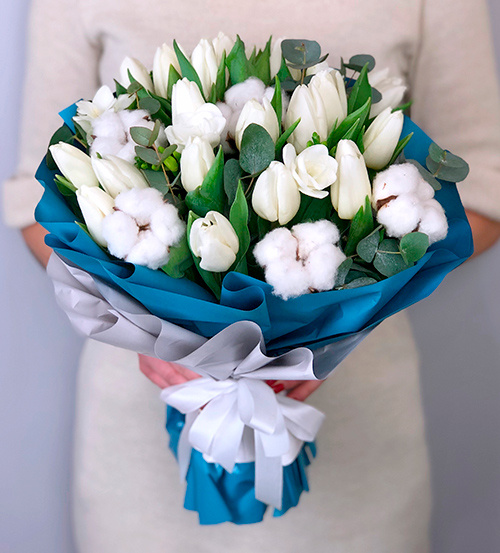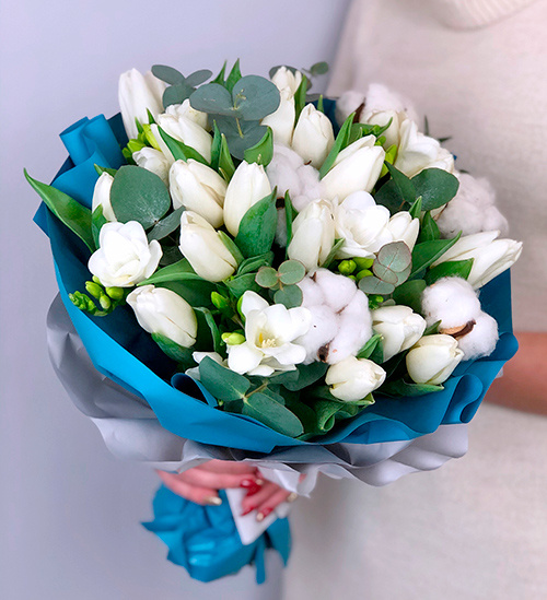Lalele Albe -20 Fire Bumbac Alb -7 Fire Frezii Albe -7 Fire Eucalipt -3 Fire Ambalaj -4 Folii |