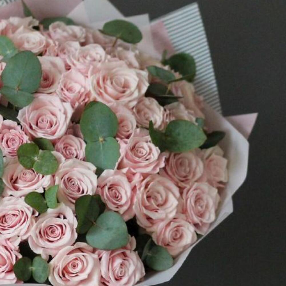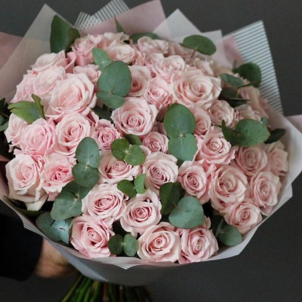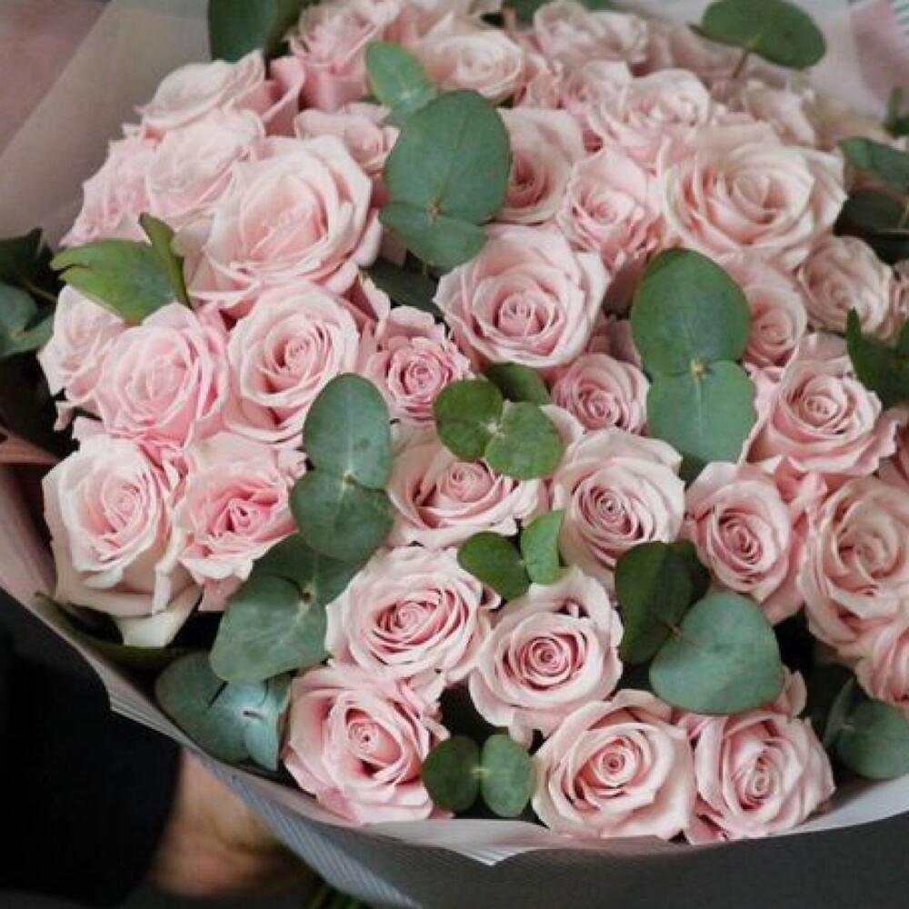 Încântă-ți simțurile cu acest buchet elegant format din 51 de trandafiri roz pal și 10 fire de frunze de eucalipt. Cu o înălțime de 40 cm, acest aranjament floral este ideal pentru a adăuga o notă de frumusețe și rafinament oricărei ocazii speciale, fie că este vorba de aniversări, zile de naștere sau momente romantice.