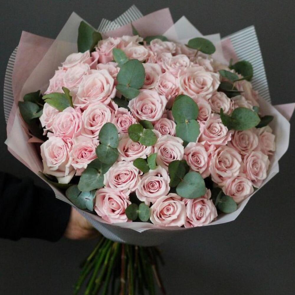 Descriere produs: Buchet cu 51 Trandafiri Roz Pal și Eucalipt