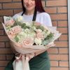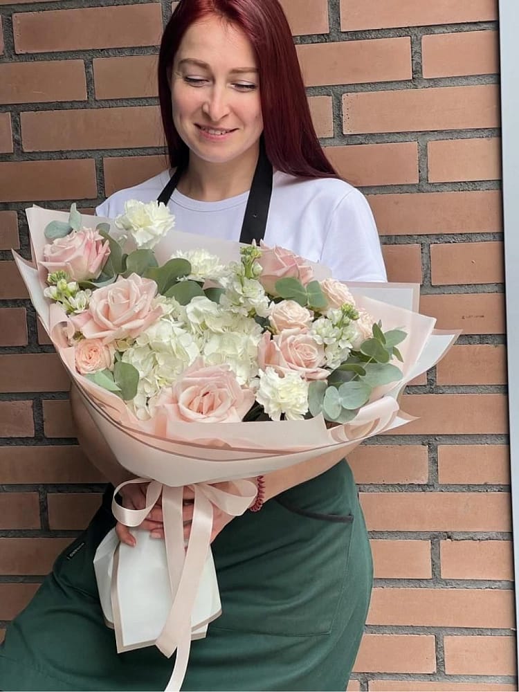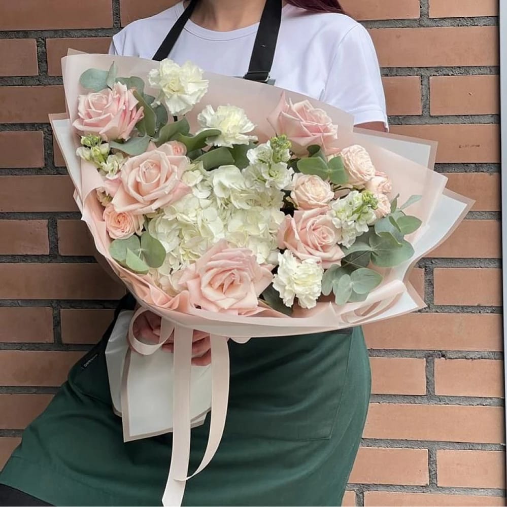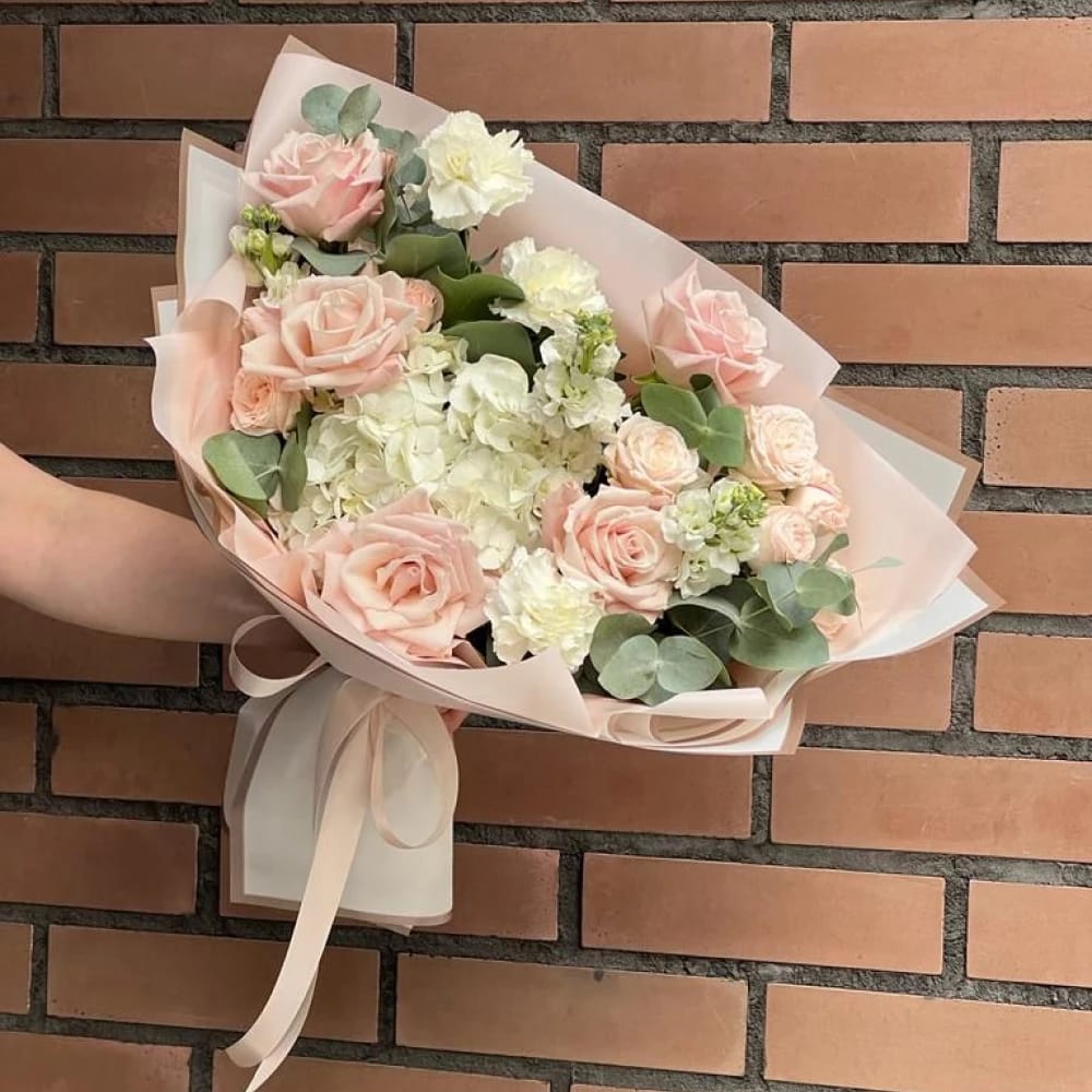 Buchet Flori Cu Hortensie Albă Și Trandafiri Roz Pudrat – Descriere