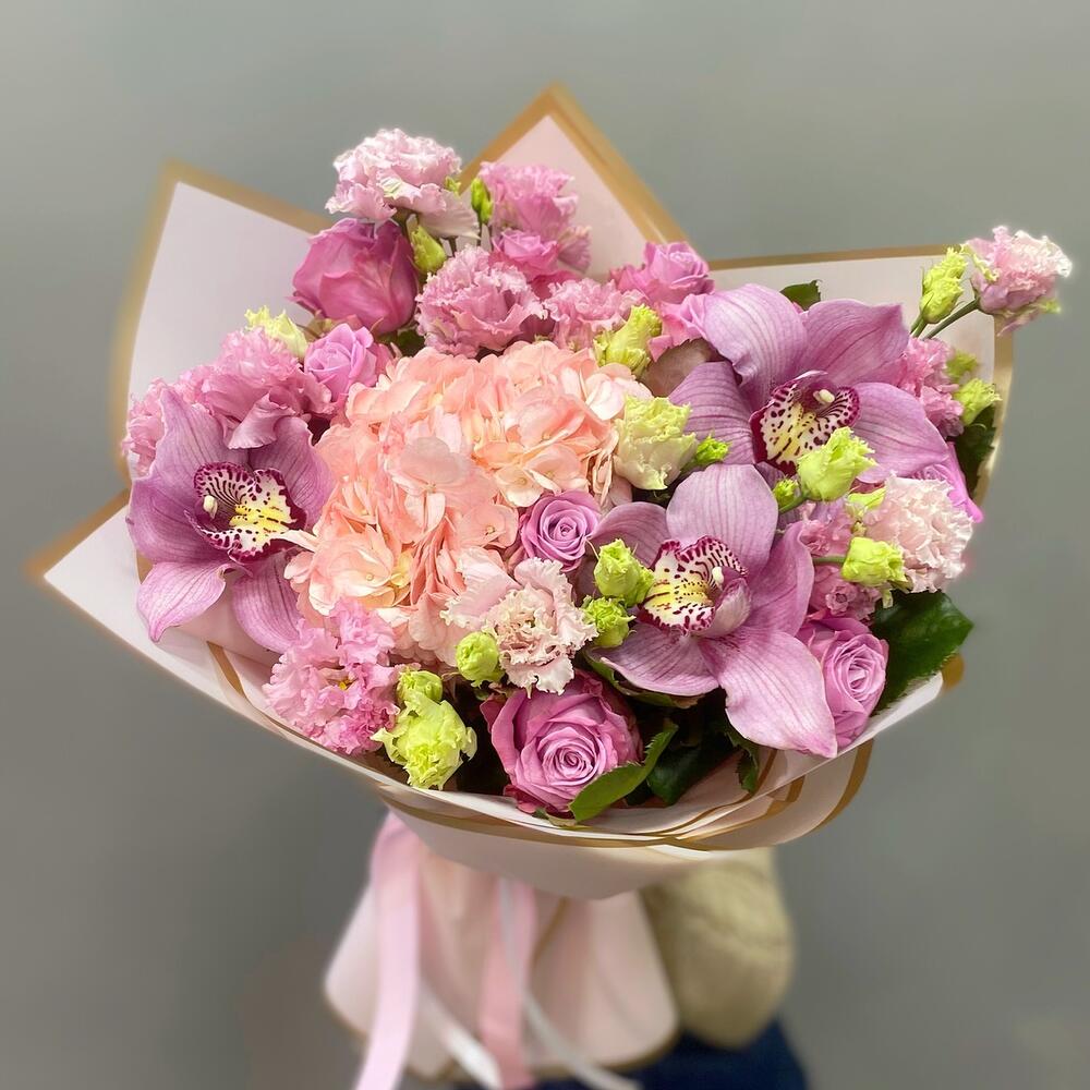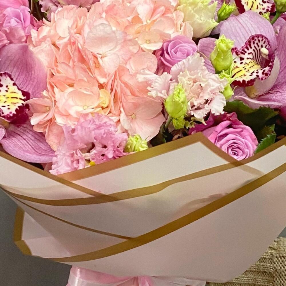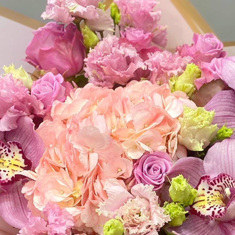 Buchet Flori Cu Hortensie Roz Si Trandafiri Mov – Descriere