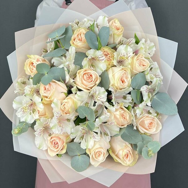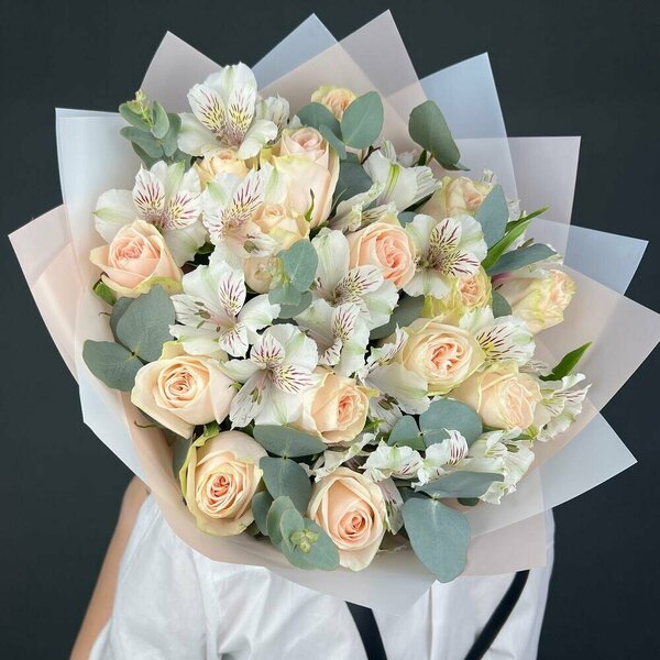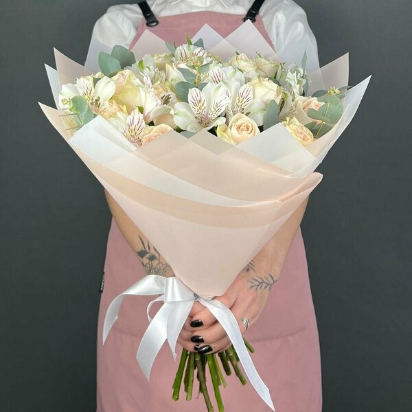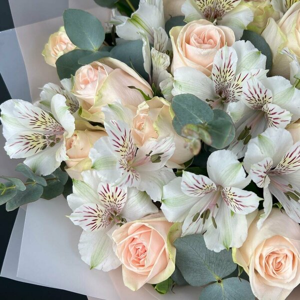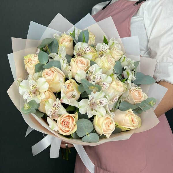 Buchet Flori Cu Trandafiri Crem Și Alstroemerie Albă