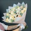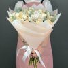 Buchetul este atent ambalat în nuanțe de alb și crem, formând un aspect sofisticat și armonios, perfect pentru a fi dăruit sau expus în orice încăpere.