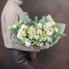 Acest buchet elegant în nuanțe de alb este o alegere rafinată, perfectă pentru orice ocazie specială sau ca un cadou pentru cei dragi. Aranjamentul combină delicatețea și frumusețea florilor albe, creând un aspect sofisticat și proaspăt.