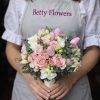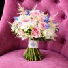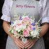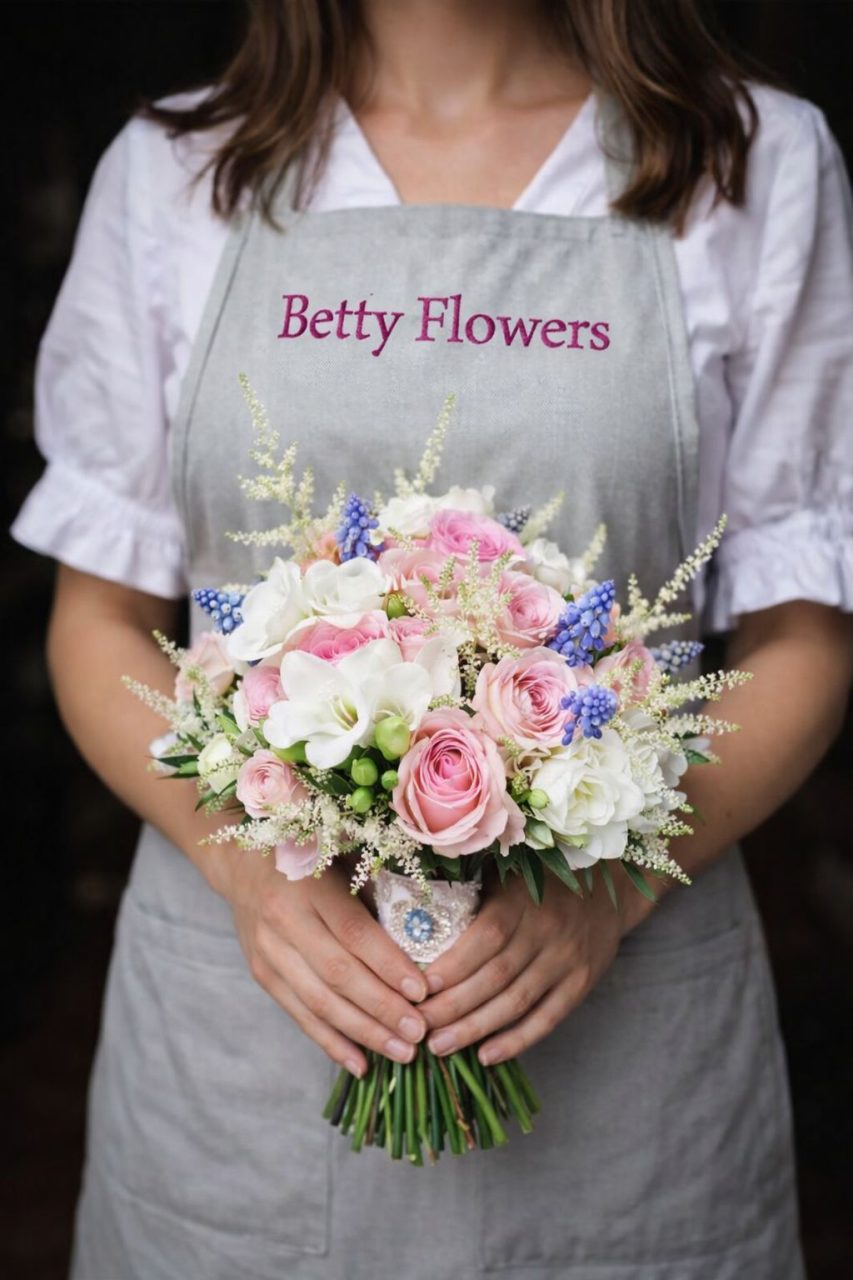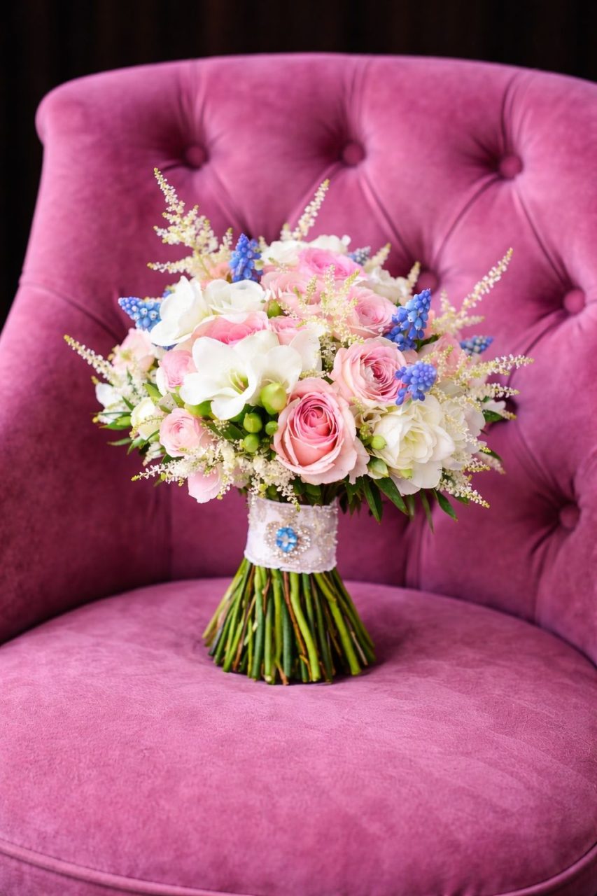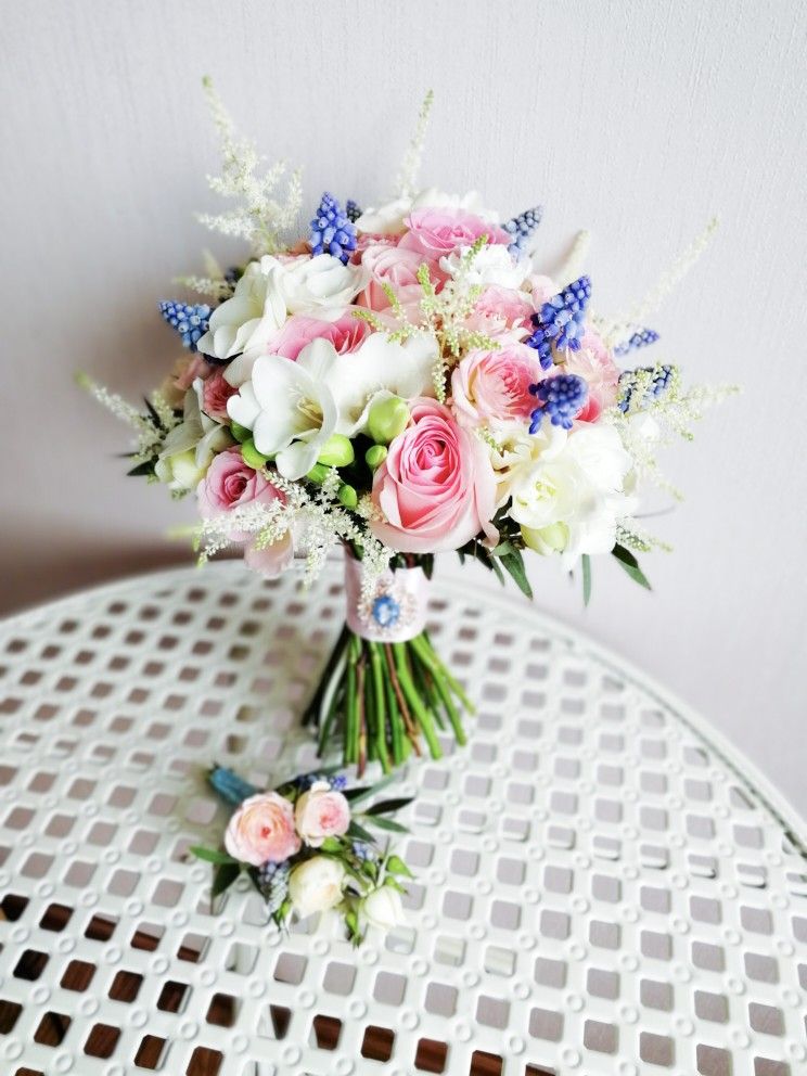 Buchet de mireasă romantic din trandafiri roz, frezii albe și muscari albaștri, realizat manual din flori proaspete. Comanda se plasează cu minimum 10 zile înainte.