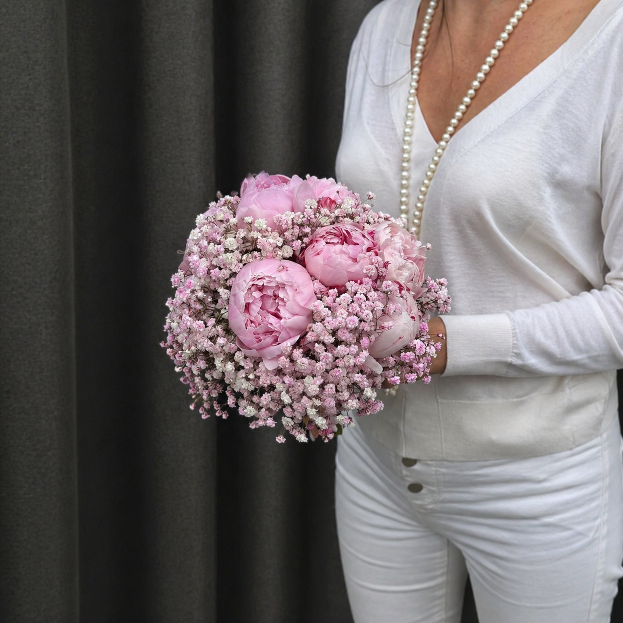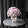 Acest buchet de mireasă cu bujori roz și gypsophila este alegerea perfectă pentru o apariție romantică și rafinată. Realizat din 7 fire de bujori roz proaspeți și 8 fire de gypsophila roz, buchetul impresionează prin volum, finețe și un aspect aerat, ideal pentru miresele care își doresc un stil elegant și natural.