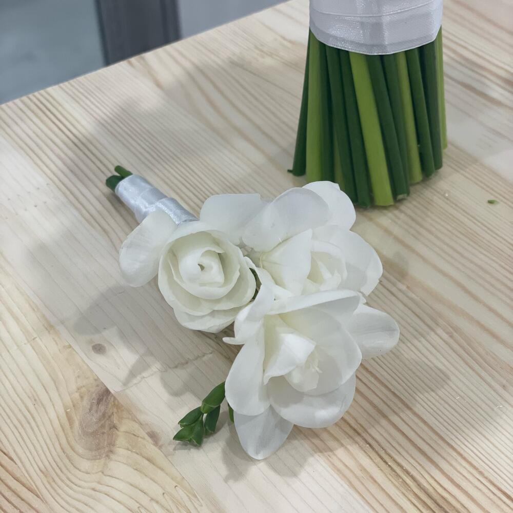 - Frezii albe – 17 fire: Freziile albe, cu aroma lor delicată și aspectul vesel, completează perfect buchetul. Acestea aduc un sentiment de bucurie și optimism, simbolizând iubirea și prietenia. Combinarea freziilor cu calele oferă o textură bogată și un aspect deosebit aranjamentului floral.