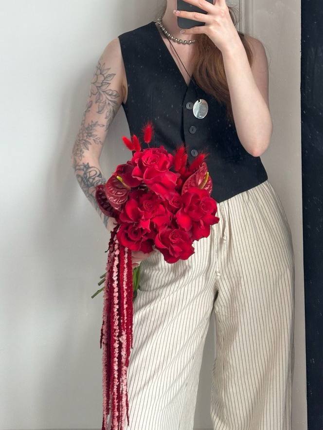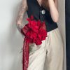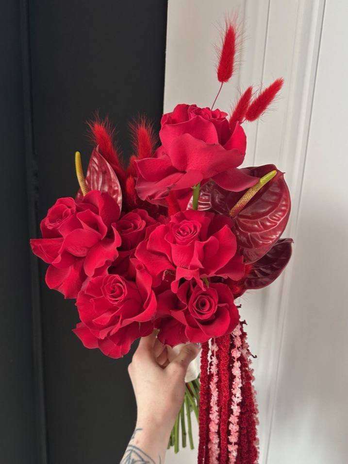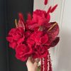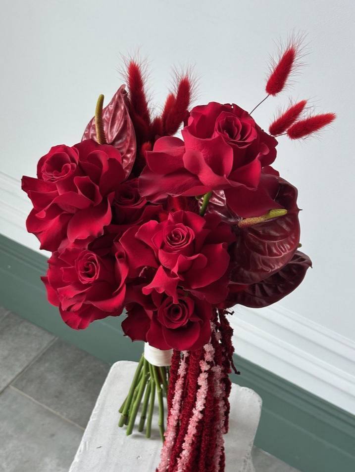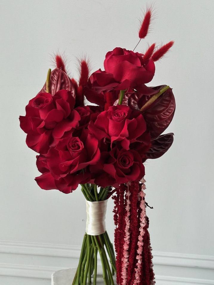 Descriere Produs: Acest buchet elegant de mireasă este o alegere perfectă pentru o zi specială. Combinând frumusețea trandafirilor roșii francezi cu eleganța anthuriumului grena, acest buchet emana rafinament și sofisticare. În plus, firele de lagurus grena și amaranthusul grena adaugă un plus de textură și originalitate, creând o compoziție florală deosebită.