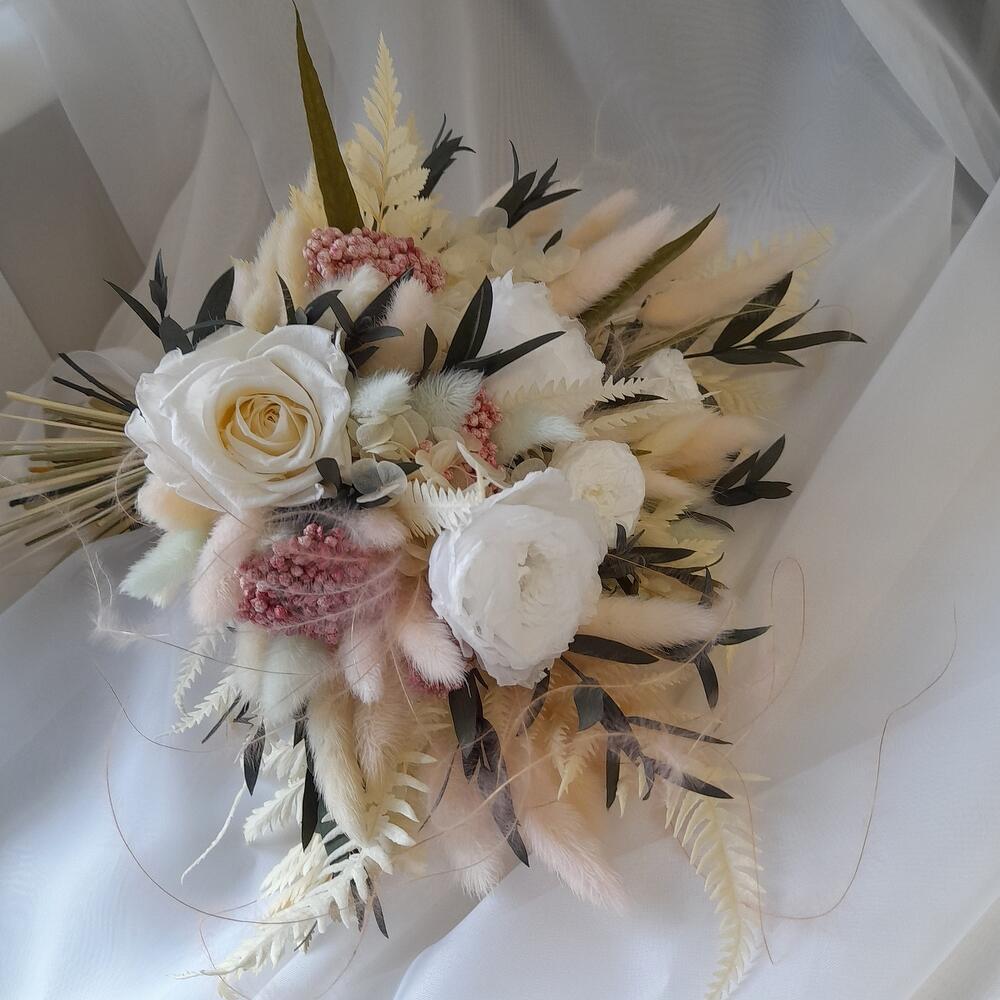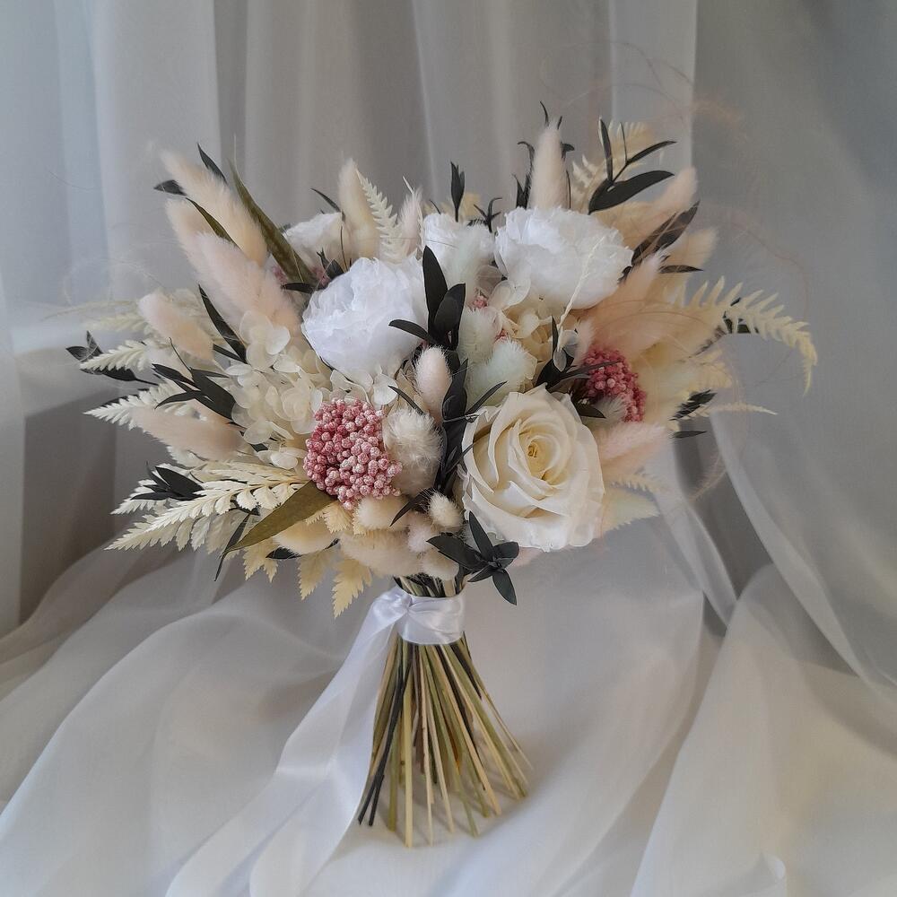 Buchet mireasa nemuritor din trandafiri criogenati, mini rosa, plante