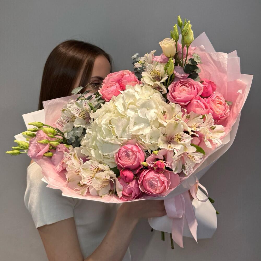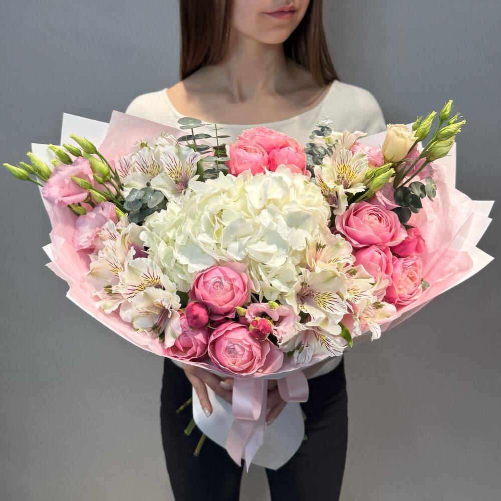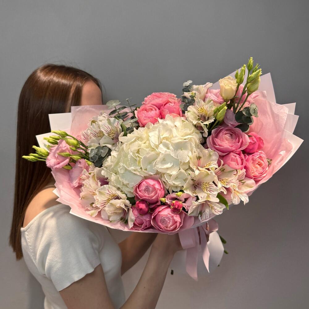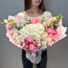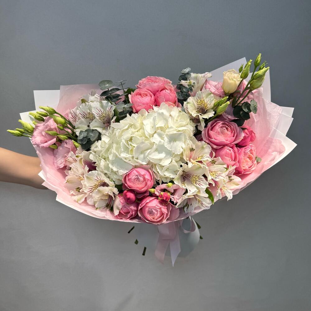 Acest buchet romantic în nuanțe delicate de alb și roz este alegerea perfectă pentru momente pline de emoție și eleganță. Realizat cu o hortensie albă voluminoasă în centrul aranjamentului, accente de trandafiri miniroze roz, lisianthus fin și alstromerii albe, buchetul transmite rafinament și gingășie. Frunzele de eucalipt adaugă prospețime, iar ambalajul elegant în tonuri pastel oferă o notă premium, transformând acest buchet într-un cadou ideal pentru aniversări, declarații de iubire, surprize romantice sau orice ocazie specială.