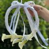 Adăugați un strop de eleganță și rafinament nunții dumneavoastră cu acest buchet de mireasă distinctiv, realizat din cale albe. Fiecare tijă de cală este decorată cu perle strălucitoare, care completuează frumusețea florilor și adaugă un element sofisticat.