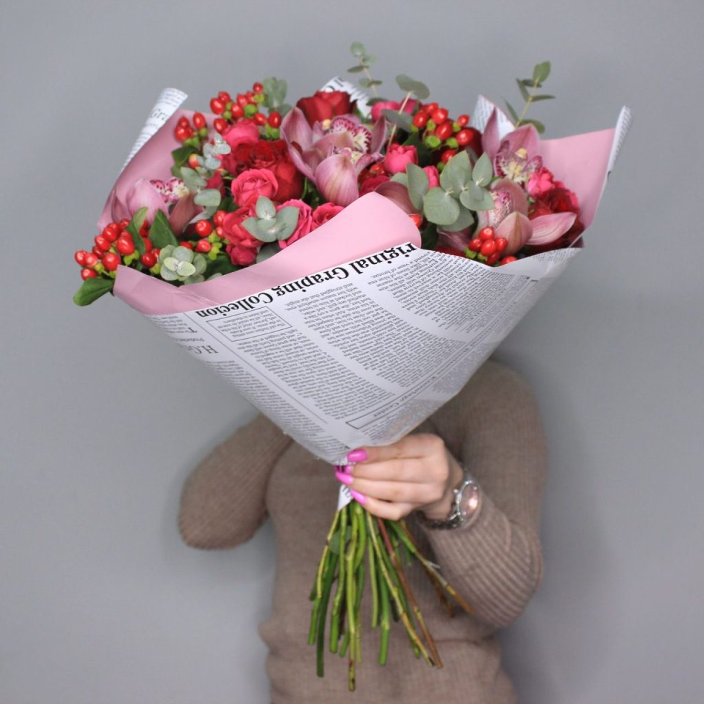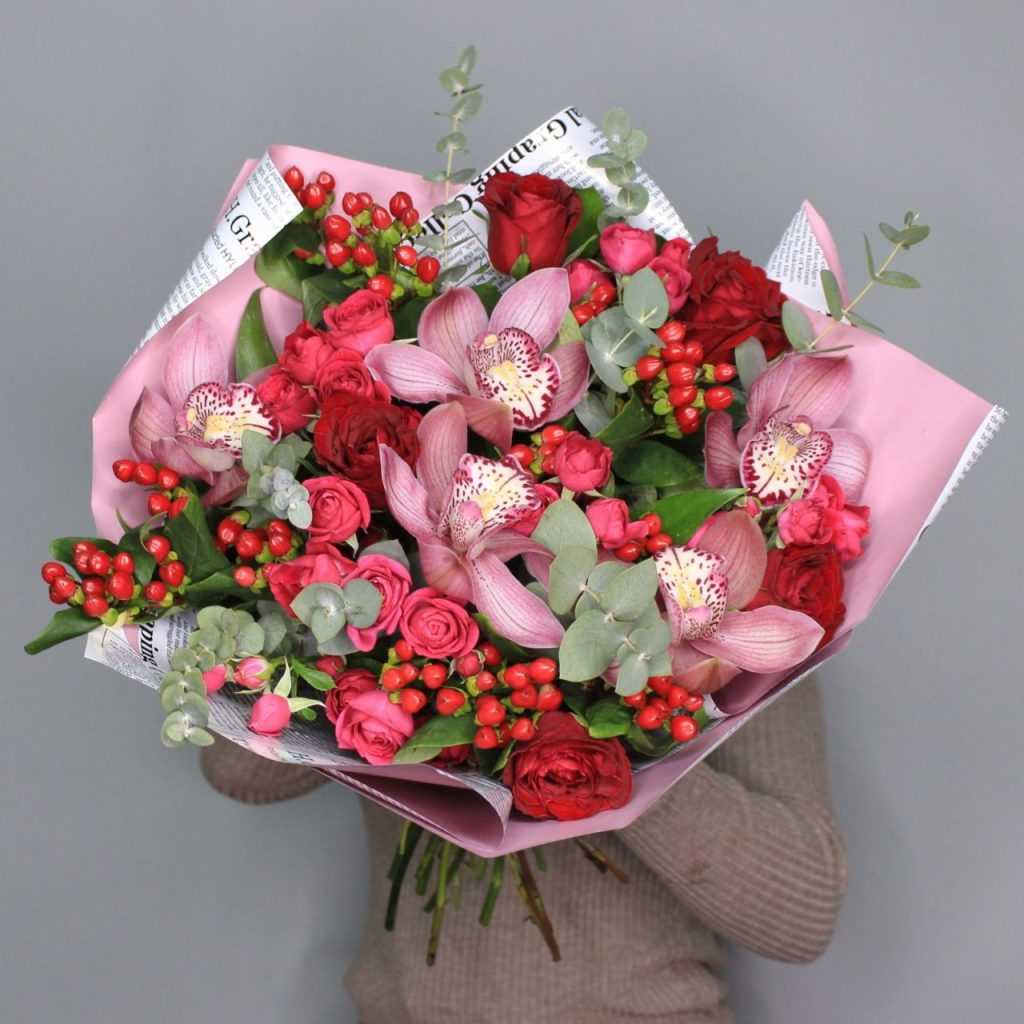 Combinând eleganța trandafirilor roșii, care simbolizează dragostea și pasiunea, cu delicatețea orhideelor roz, acest aranjament floral emană frumusețe și rafinament. Buchetul conține 5 fire de trandafiri roșii, 5 mini rose roz, 3 fire de hipericum roșu și 5 cupe de orhidee roz, toate îmbogățite cu frunze de eucalipt pentru un aspect fresh și modern.