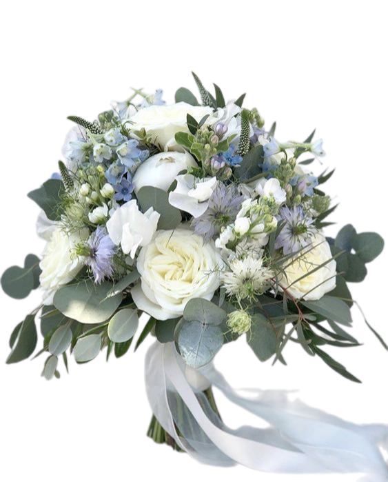 Buchetul Mirese Rc 3 conține trandafiri albi de grădină, bujori albi, matiola albă, delfinium albastru, fire fine de veronică albă și eucalipt. Această combinație armonioasă de flori va completa cu eleganță ținuta ta în ziua cea mare.