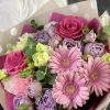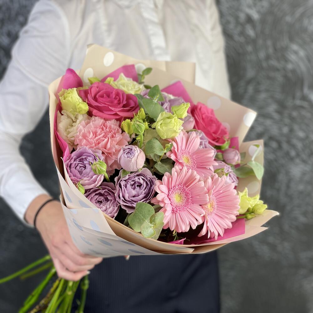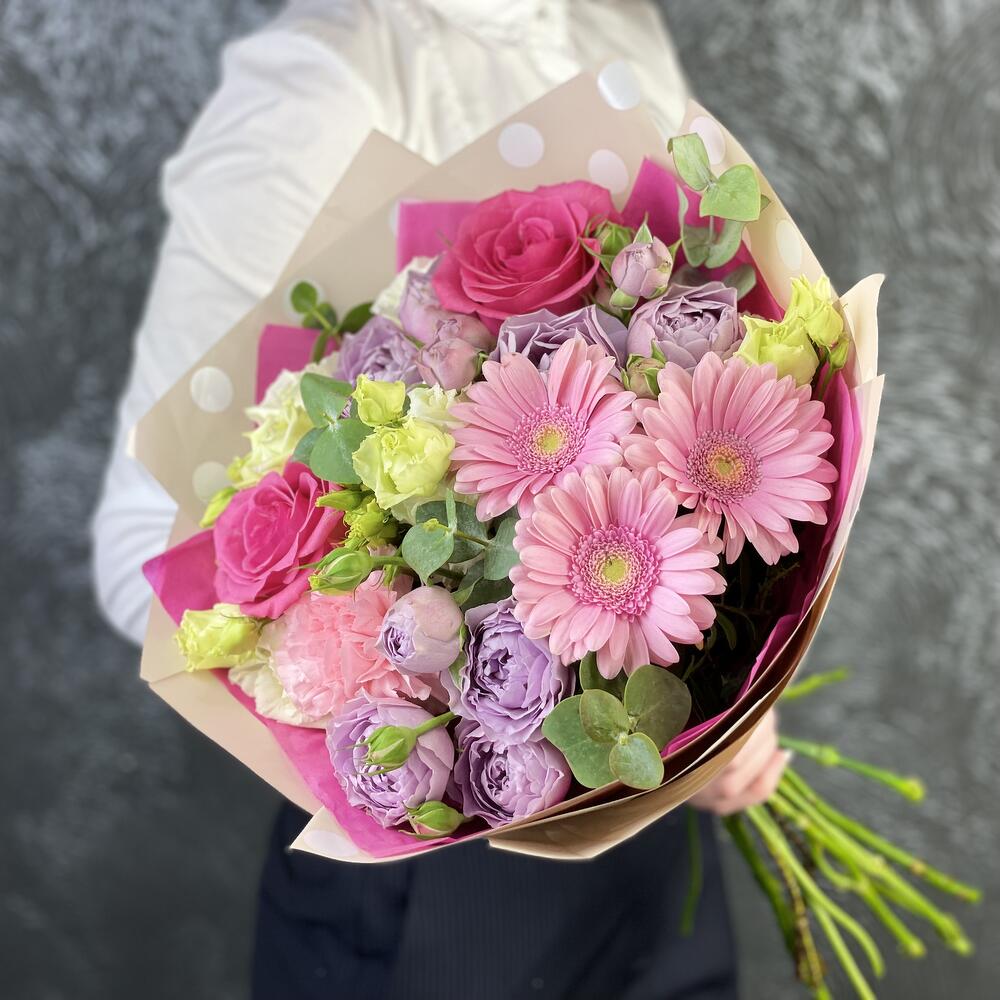Germini roz – 3 fire superbe, pline de energie Trandafiri Pink Floyd fucsia – 2 fire spectaculoase, punctul central al buchetului Trandafiri spray (crenguță) lila – 2 fire pentru un volum romantic Lisianthus alb proaspăt – 2 fire elegante și delicate Garoafă roz – 1 fir pentru textură și rezistență Frunze de eucalipt proaspăt – 3 fire pentru parfum și prospețime Crenguță de fistic decorativ – 1 fir pentru un volum natural Ambalaj premium din hârtie de mătase și folie decorativă cu buline – 1 buc.
