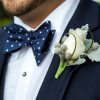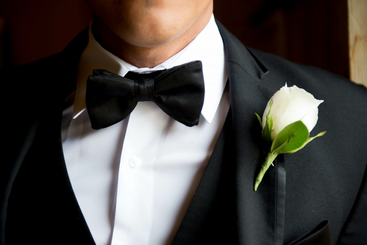 O cocarda clasica, distinsa, alcatuita din trandafir alb incadrat de frunzulite si flori decorative