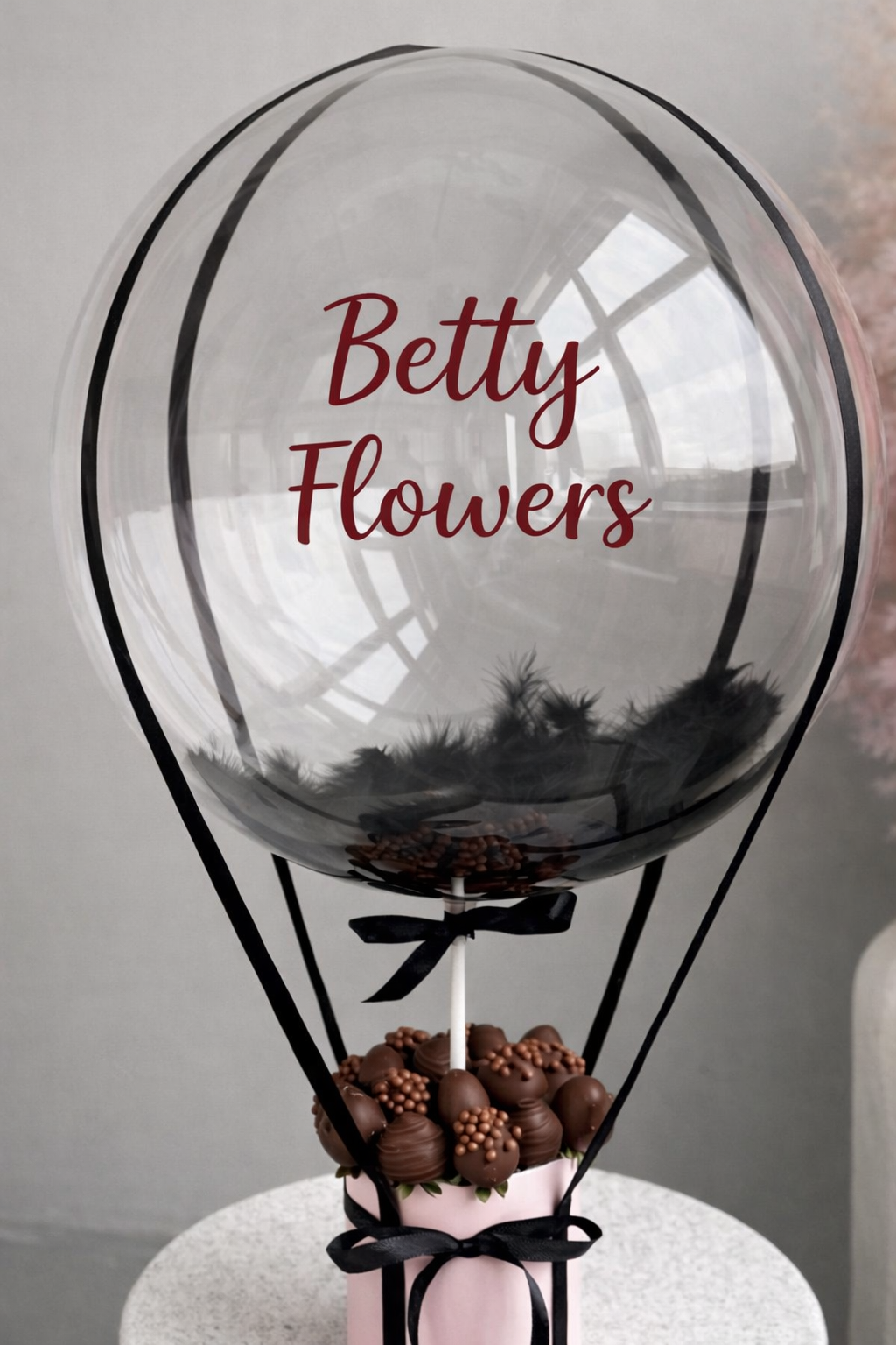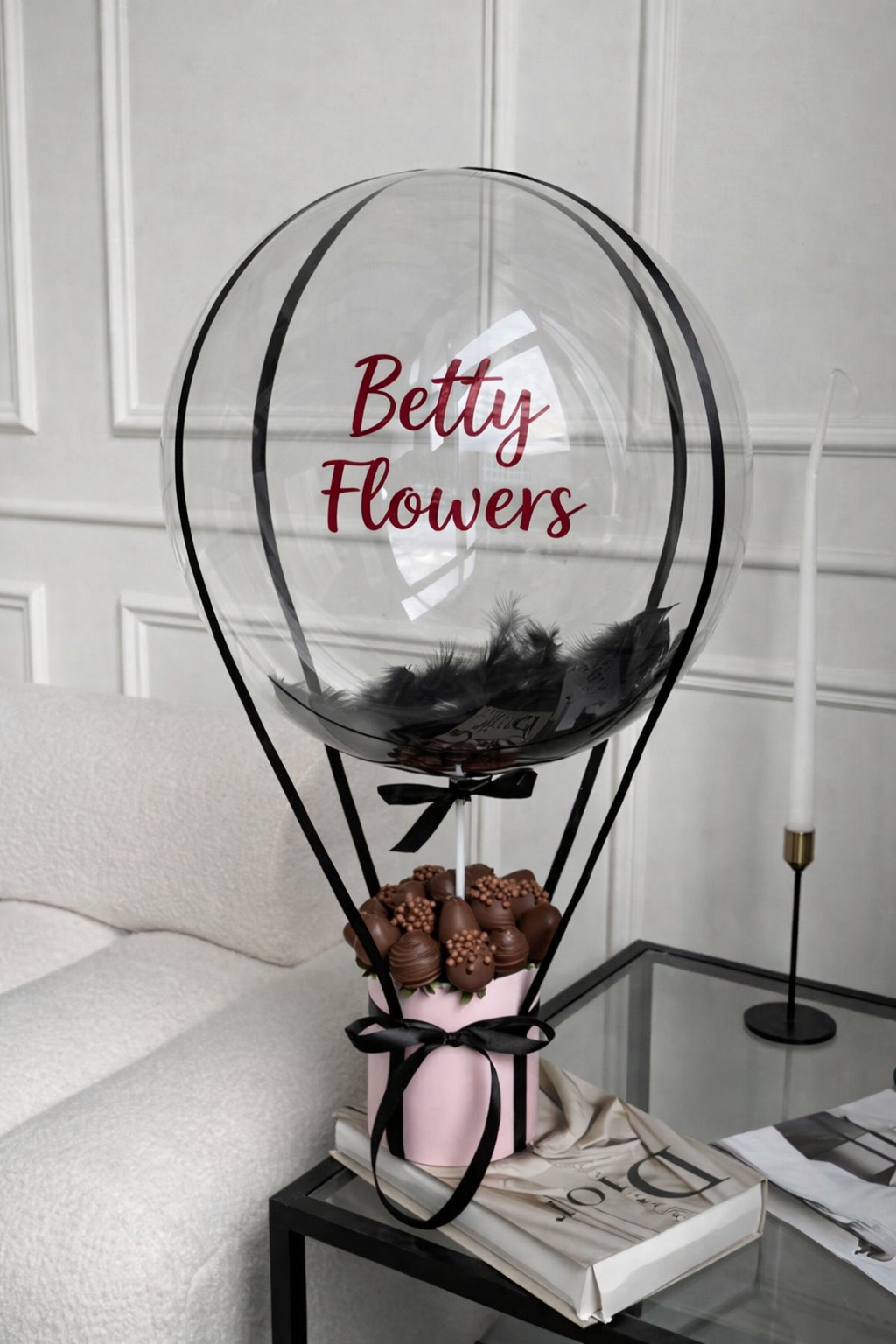 Deasupra cutiei este montat un balon Bobo transparent, decorat cu pene negre, care oferă un aer sofisticat și exclusivist întregului aranjament.