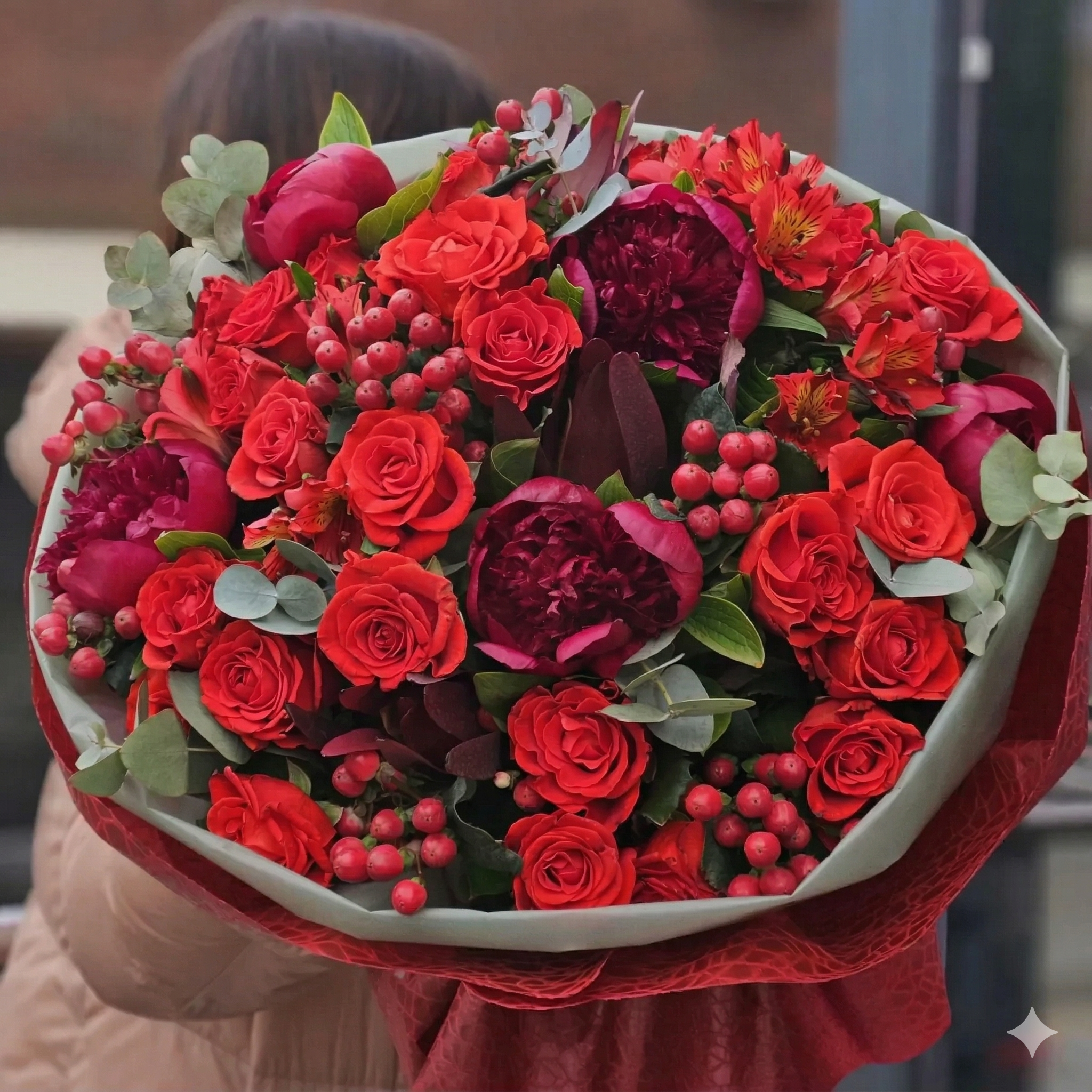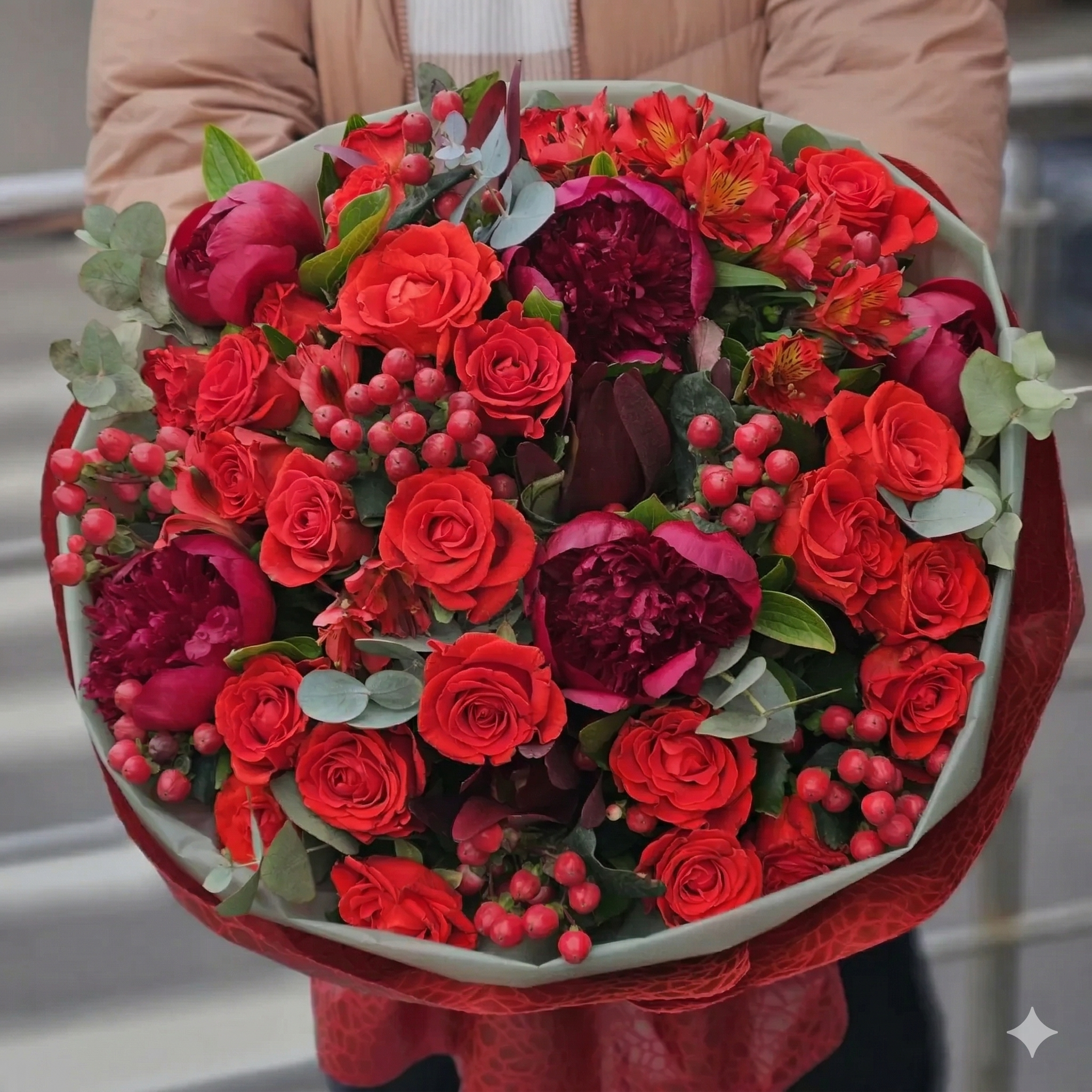 Acest buchet de lux cu bujori și trandafiri este, fără îndoială, definiția opulenței rafinate. Creat pentru momentele care marchează o viață, aranjamentul impresionează prin volumul său gigantic și prin paleta cromatică intensă de roșu și grena (burgundy). Este o piesă centrală care îmbină parfumul inconfundabil al bujorilor cu rezistența trandafirilor premium.