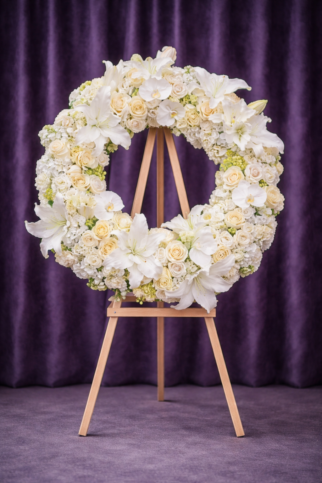 Fie că doriți să aduceți un omagiu cu eleganță și rafinament sau să transmiteți un mesaj de condoleanțe profund empatic, Coroana Alba Eleganta este alegerea perfectă pentru a exprima sentimentele dumneavoastră într-un mod plin de respect și frumusețe.