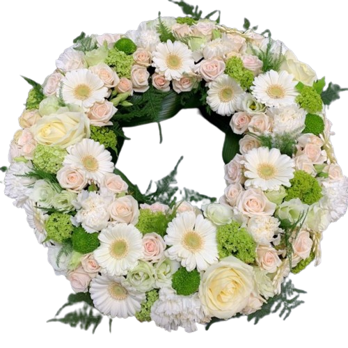 Realizată cu grijă și atenție la detalii, această coroană conține gerbera albă (10 fire), miniroze (10 fire), garoafe albe (20 de fire), trandafiri albi (10 fire), viburum verde (10 fire) și verdețuri care completează armonios designul.