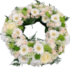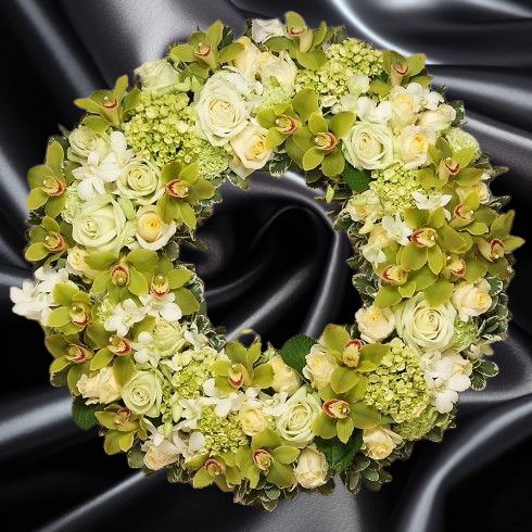 Coroana funerară Orhidee și Hortensie Verde conține elemente florale de o frumusețe aparte: orhidee verde, trandafiri albi în număr de 30 de fire, hortensie verde cu 4 fire, crizanteme albe pe 5 tije și frunziș verdeata pentru un aspect complet și armonios.