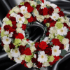Coroana funerară cu poză nr. 2 este un aranjament floral impresionant, creat pentru a aduce un omagiu deosebit persoanei iubite care a plecat dintre noi. Cu o combinație armonioasă de nuanțe roșii și verzi, această coroană funerară transmite un mesaj de iubire și respect etern.