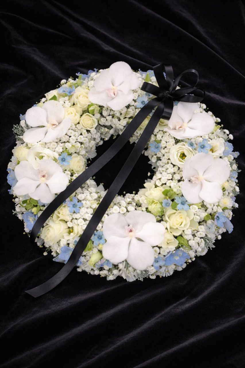 Coroana funerară de lux cu flori albe și blue este o alegere rafinată și emoționantă pentru a aduce un omagiu deosebit celor dragi. Cu un diametru impresionant de 55 cm, această coroană este realizată cu grijă și atenție la detalii, combinând frumusețea simplă a florilor albe cu accentele elegante de albastru.