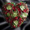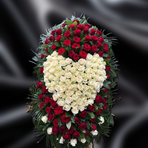 Realizată cu 70 de fire de trandafiri roșii, simbol al iubirii eterne, coroana este accentuată în mijloc de o inimă delicată formată din 50 de fire de trandafiri albi, ce reprezintă puritatea și amintirea frumoasă a celor plecați. Verdeața proaspătă completează acest aranjament floral, oferind un aspect natural și rafinat.