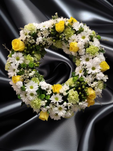 Coroana Funerară Formă Rotundă în Nuanțe de Alb, Galben și Verde este un simbol al iubirii veșnice și al amintirilor frumoase. Oferă-i un ultim omagiu cu această coroană deosebită, care va rămâne ca o amintire luminoasă în inimile celor care au cunoscut și iubit pe cel plecat.