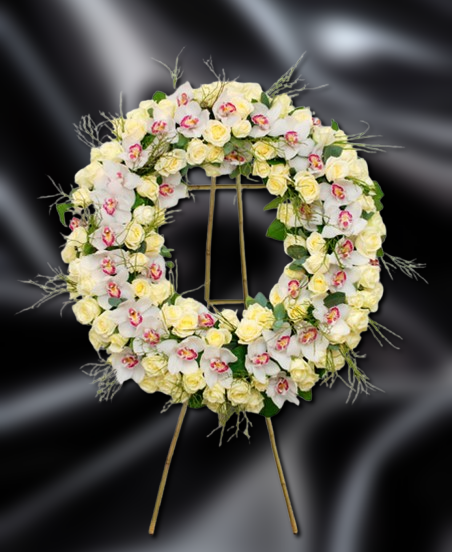 Coroana Funerară în Nuanțe de Alb – Trandafiri și Orhidee