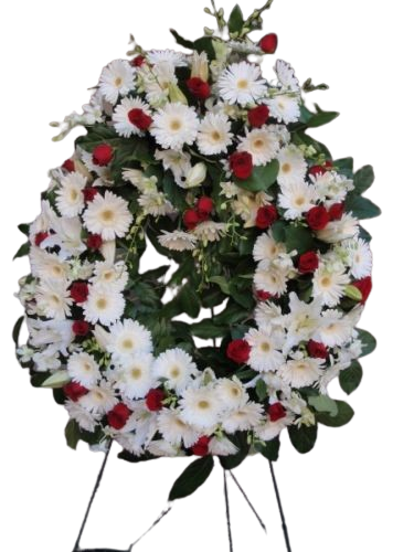 Realizată cu măiestrie, coroana funerară conține 40 de fire de Gerbera Albă, 30 de fire de Trandafiri Roșii, 5 fire de Crin Alb și verdețuri naturale, creând o combinație armonioasă și plină de frumusețe.