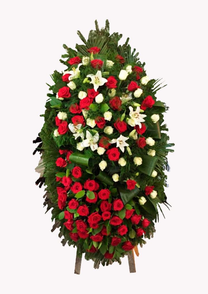 Coroana funerara deosebit de frumoasa, ce este construita din 60 pana la 100 fire de trandafiri albi si rosii ornati cu frunze decorative