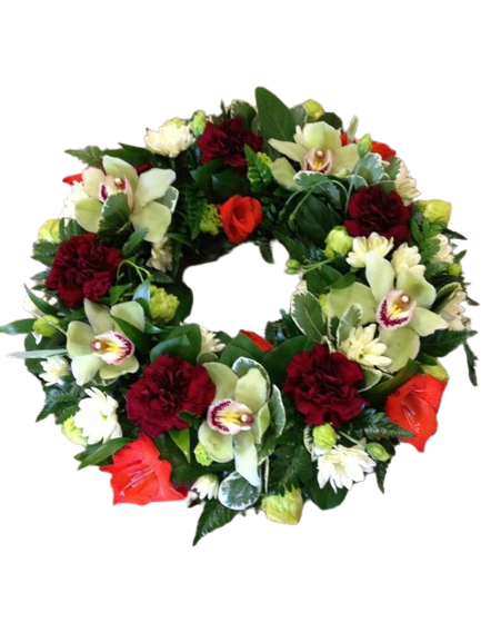 Coroana Funerară Orhidee și Garoafe este un produs elegant și sobru, perfect potrivit pentru a aduce un omagiu deosebit unei persoane dragi care ne-a părăsit. Această coroană are un diametru de 55 cm și este alcătuită dintr-o combinație armonioasă de flori prețioase.