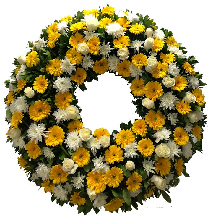 Coroana Funerară Rotundă cu Diametru de 80 cm – Coroana Funerară Pe Galben și Alb