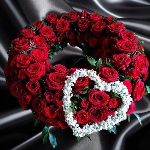 Coroana este realizată cu migală din 70 de fire de trandafiri roșii, simbol al iubirii și recunoștinței, iar inima din gipsofilă albă adaugă un element delicat și plin de sensibilitate. Fiecare detaliu este pus în valoare pentru a transmite un mesaj de profundă empatie și respect.