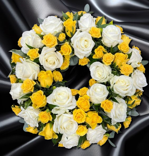 Coroana Funerara Rotunda Din Trandafiri Albi Si Trandafiri Mini Galbeni